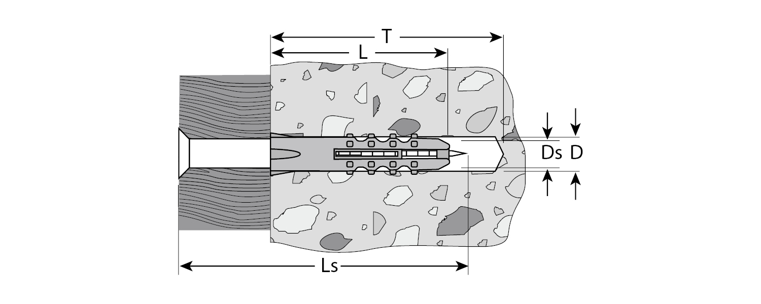 Для монтажа элементов и конструкций к полнотелым строительным материалам (бетон, кирпич, природный камень). Фиксация дюбеля в основании происходит при вкручивании в него самореза (входит в комплект поставки). Диаметр предварительного сверления: 6 мм.