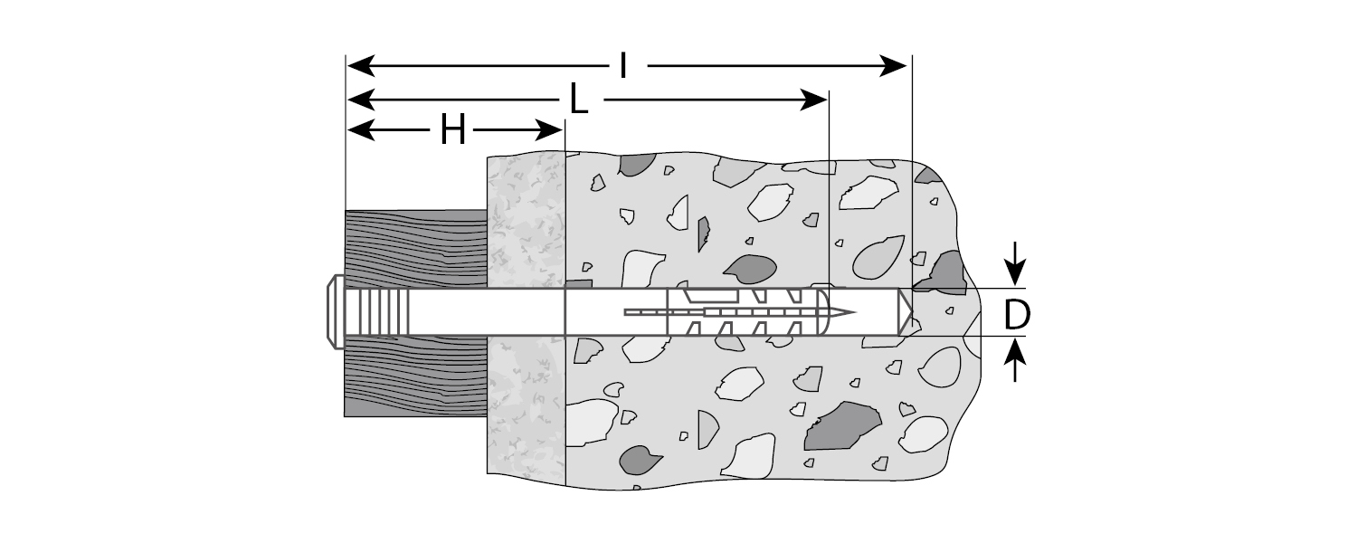 Для быстрого сквозного монтажа различных конструкций к полнотелым основаниям (бетон, кирпич, природный камень). Установка производится в предварительно просверленное и очищенное от буровой муки отверстие диаметром 6мм.