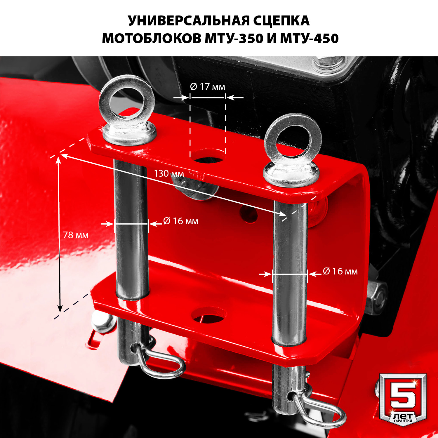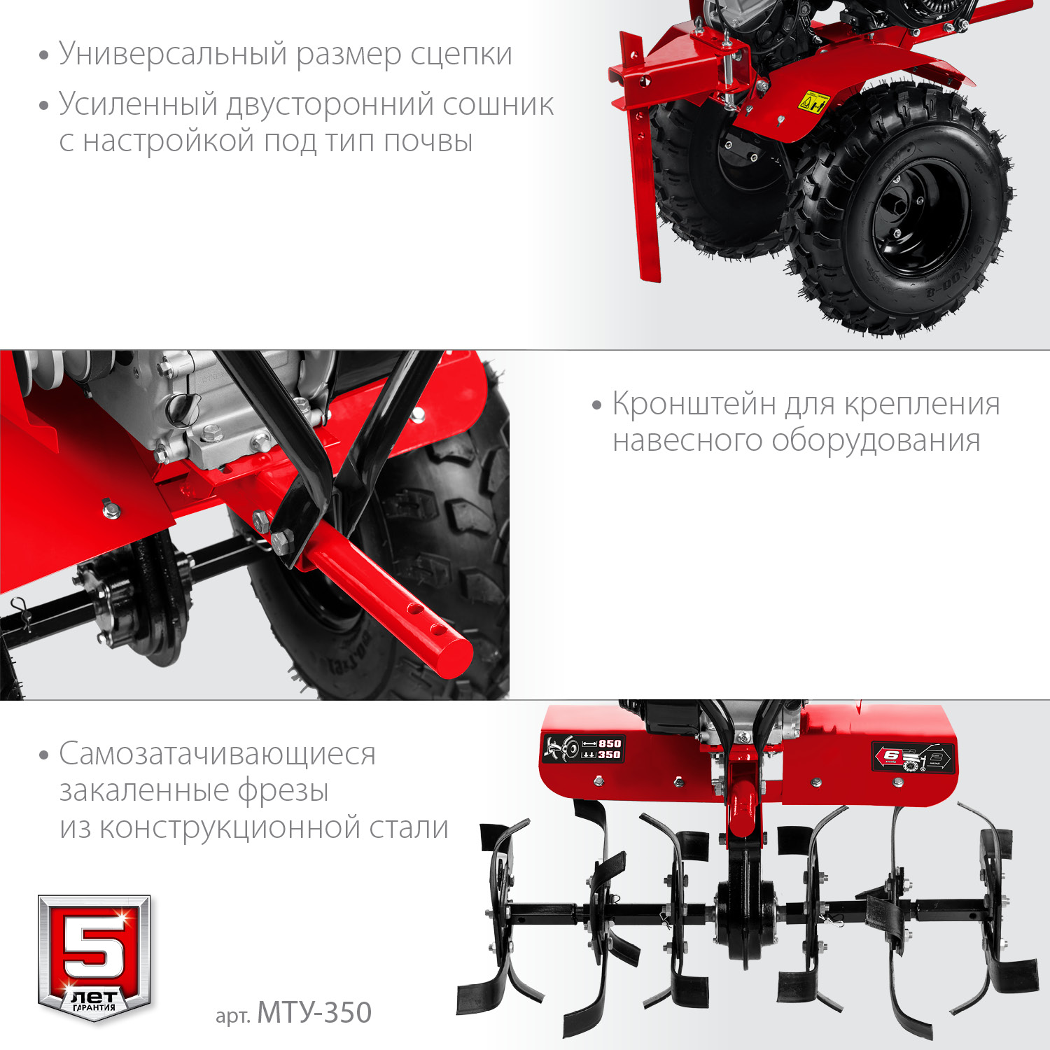 - Универсальная сцепка позволяет использовать различное навесное оборудование