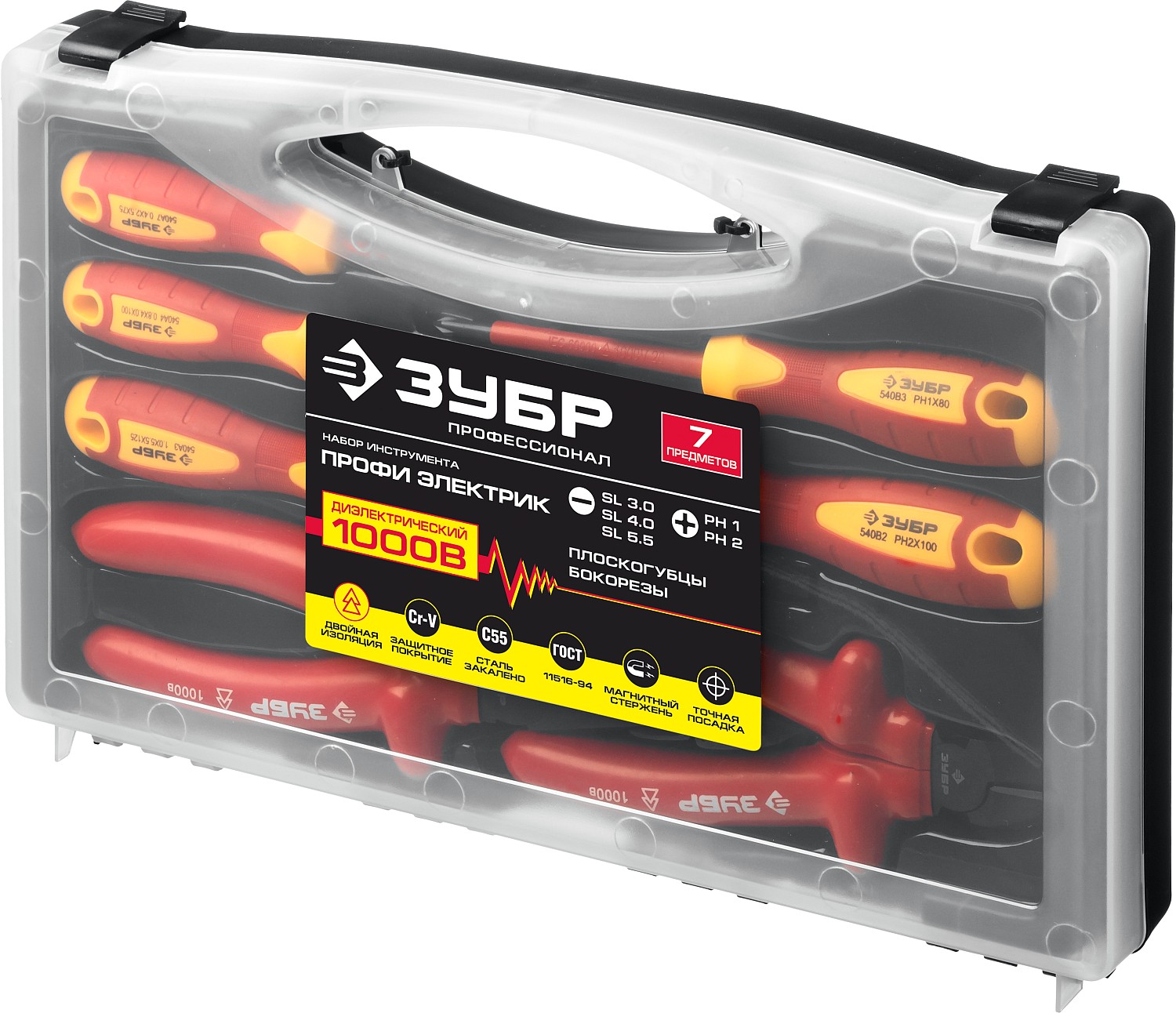 Профессиональный набор инструментов включает в себя наиболее необходимые инструменты, предназначеные для работ под напряжением до 1000 В и захвата и удерживания мелких предметов, перекусывания проволоки средней твердости и других слесарных и монтажных работах.