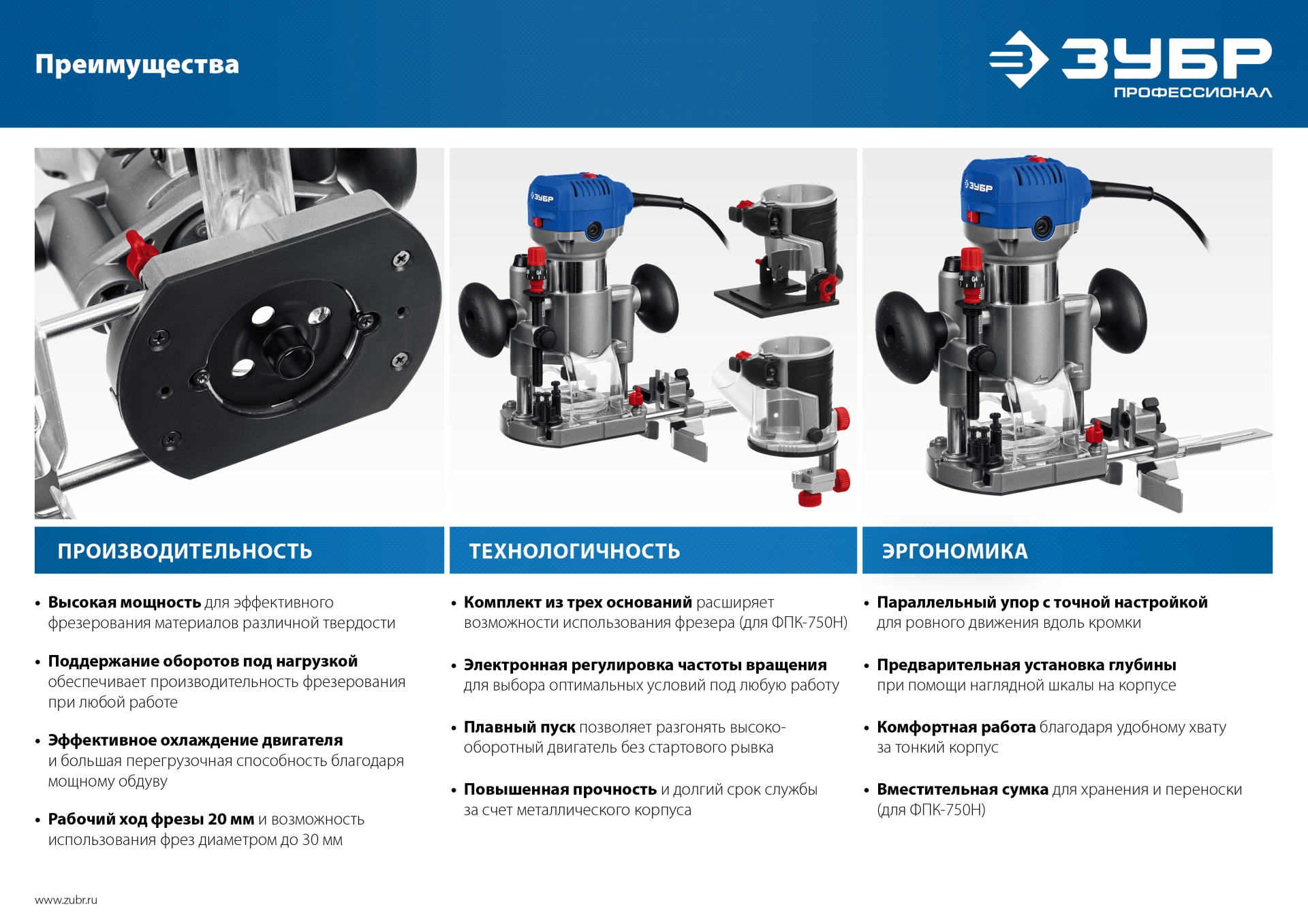 • Рабочий ход фрезы 20 мм и возможность использования фрез диаметром до 30 мм