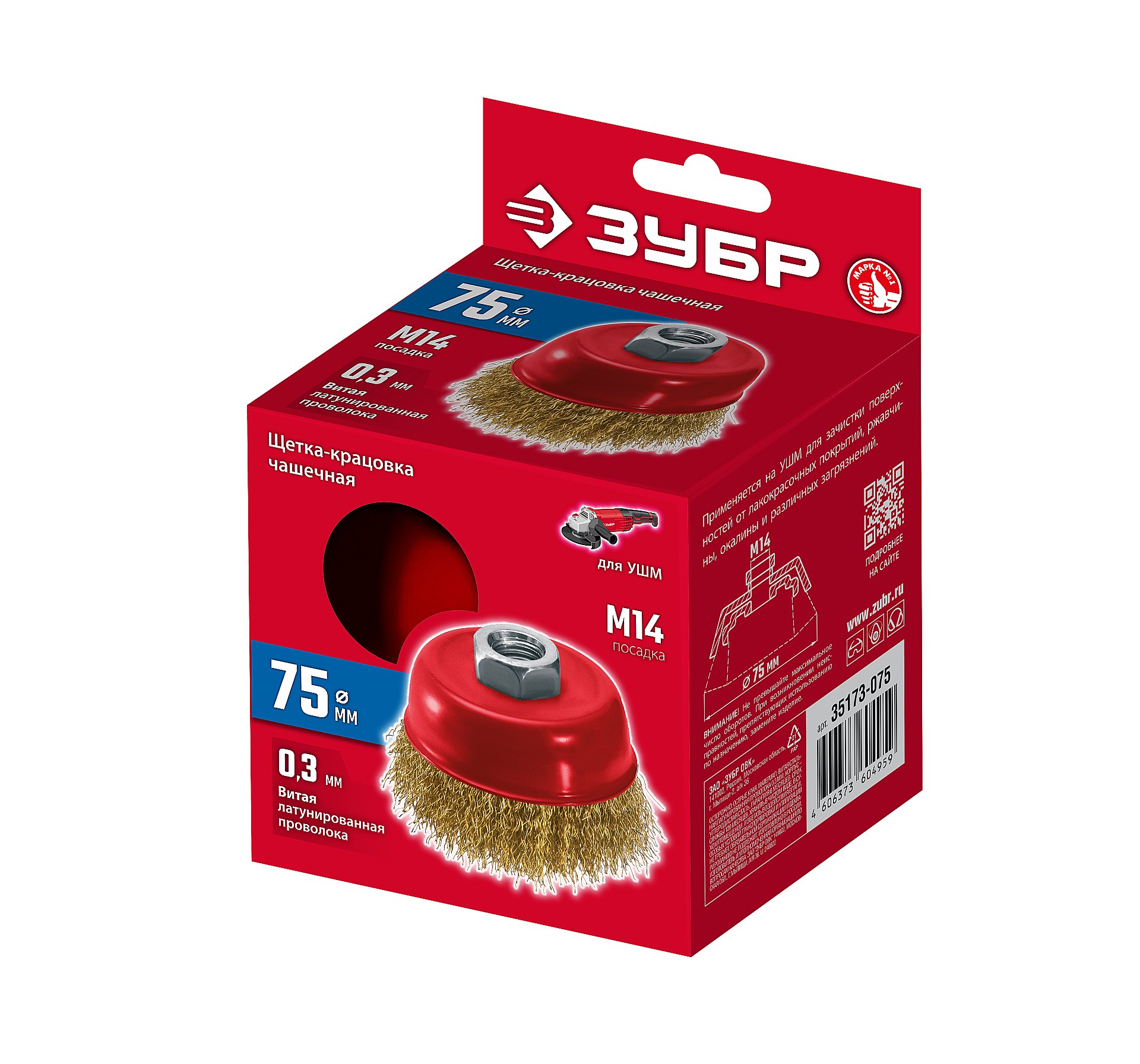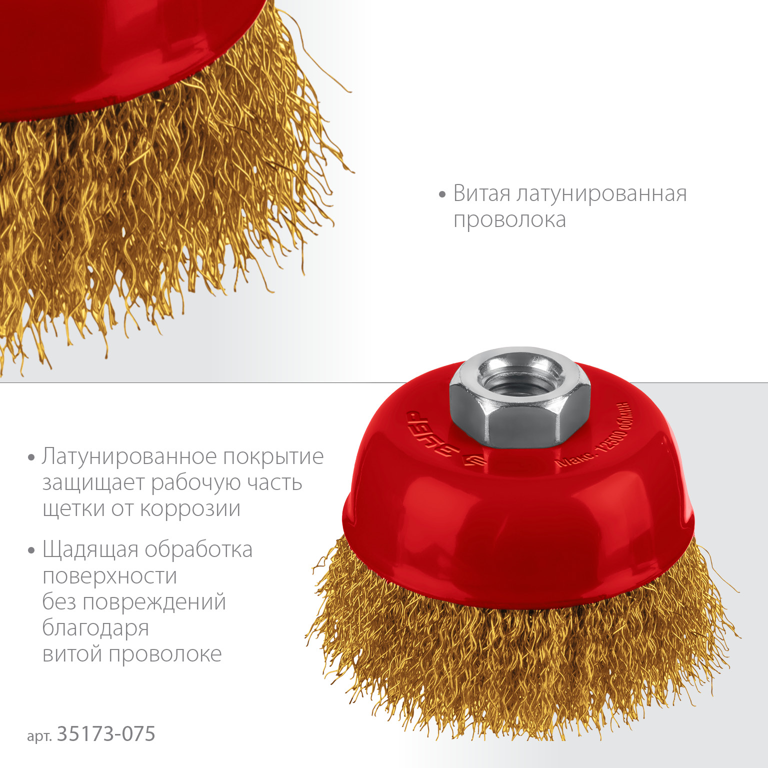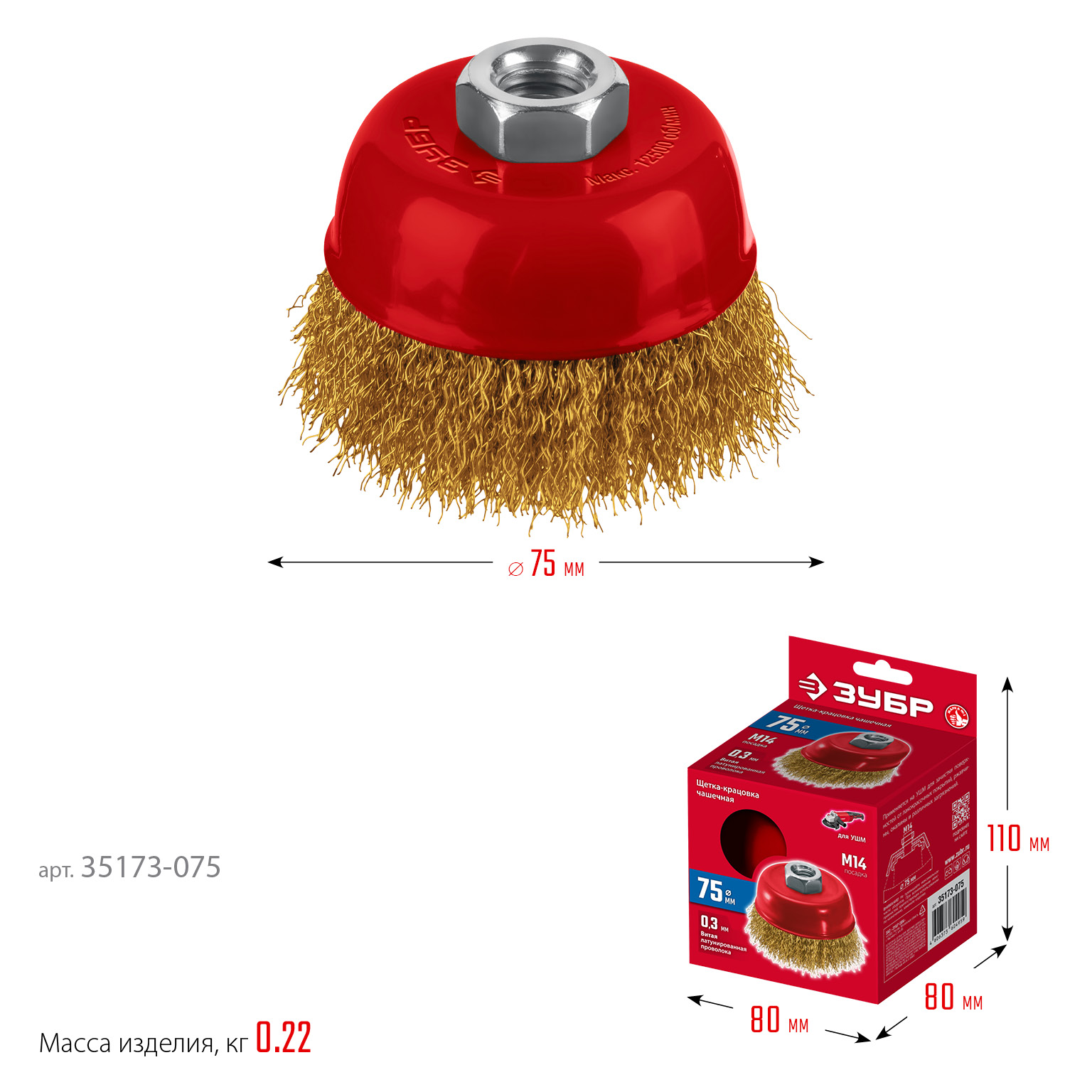 ЗУБР 75хМ14 щетка чашечная для УШМ, витая стальная латунированная проволока 0.3 мм, посад. М14 (35173-075)