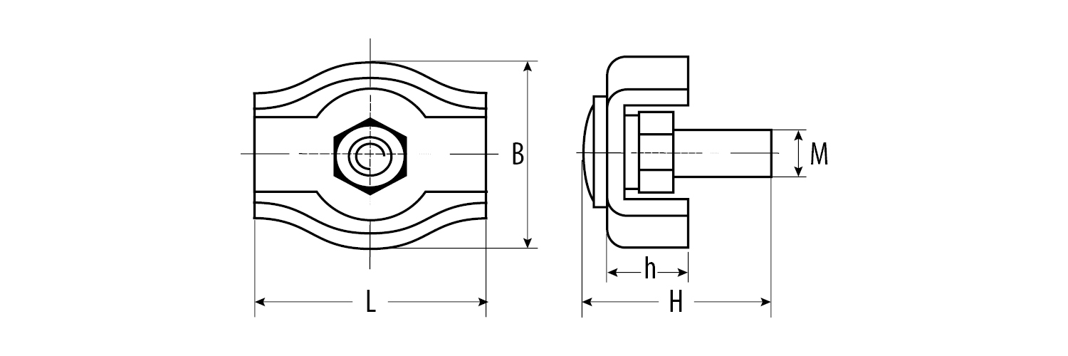 Для формирования петель на концах троса. Используются на тросах без оплетки ПВХ (если трос имеет оплетку, ее необходимо снять перед установкой зажима). Свободный конец троса закладывается в зажим (конец троса должен выходить из зажима на расстояние не менее 1/2 диаметра троса). Далее в петлю троса закладывается коуш, после которого трос помещается в зажим с другой стороны винта. Сверху помещается прижимная пластина, которую небходимо крепко зафиксировать с помощью гайки. Свободный конец троса рекомендуется обмотать изолентой для предотвращения разматывания троса после установки. Перед использованием необходимо убедиться, что гайки на зажимах закручены полностью.