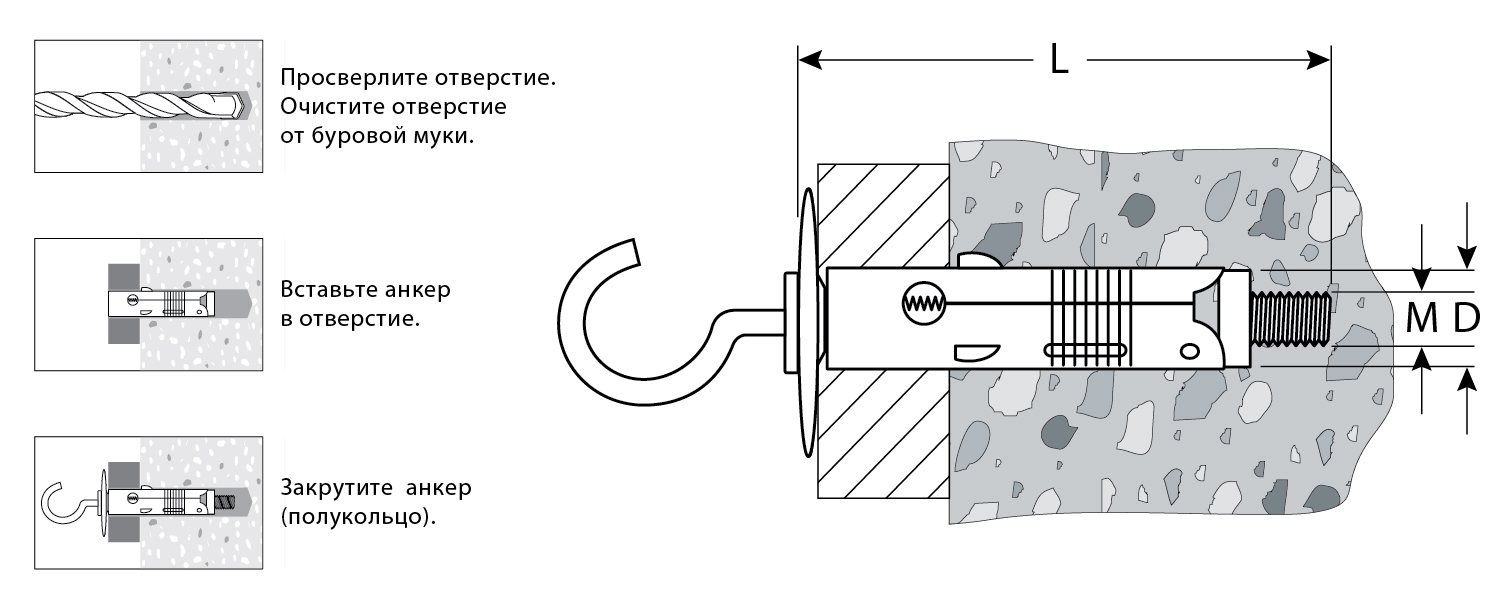 Для крепления проушин, тросов, цепей, подвесных конструкций к полнотелым основаниям: поверхностям из бетона, полнотелого кирпича или природного камня. Анкер устанавливается в предварительно просверленное и очищенное от буровой муки отверстие диаметром 8мм и глубиной не менее 55мм, расклинивание происходит при закручивании полукольца с резьбовым стержнем