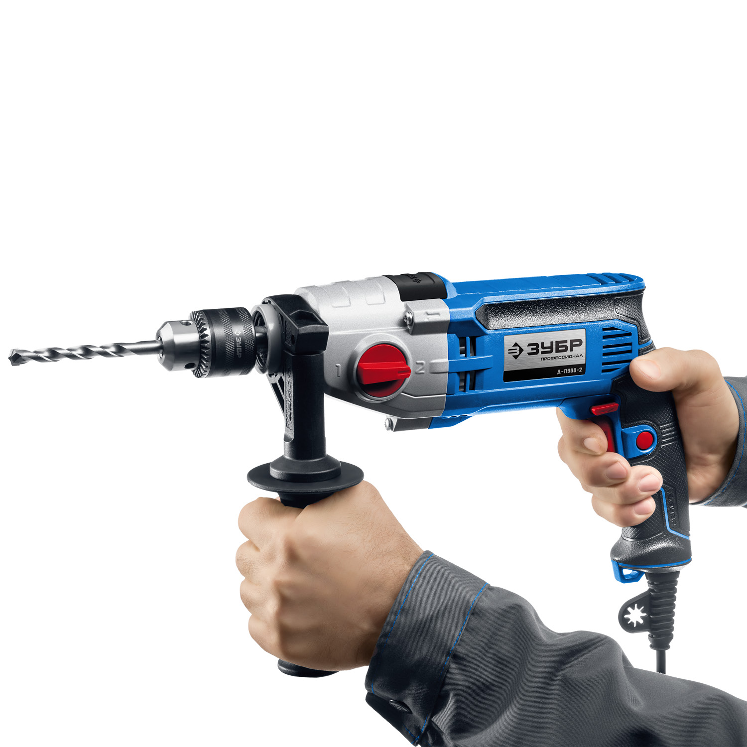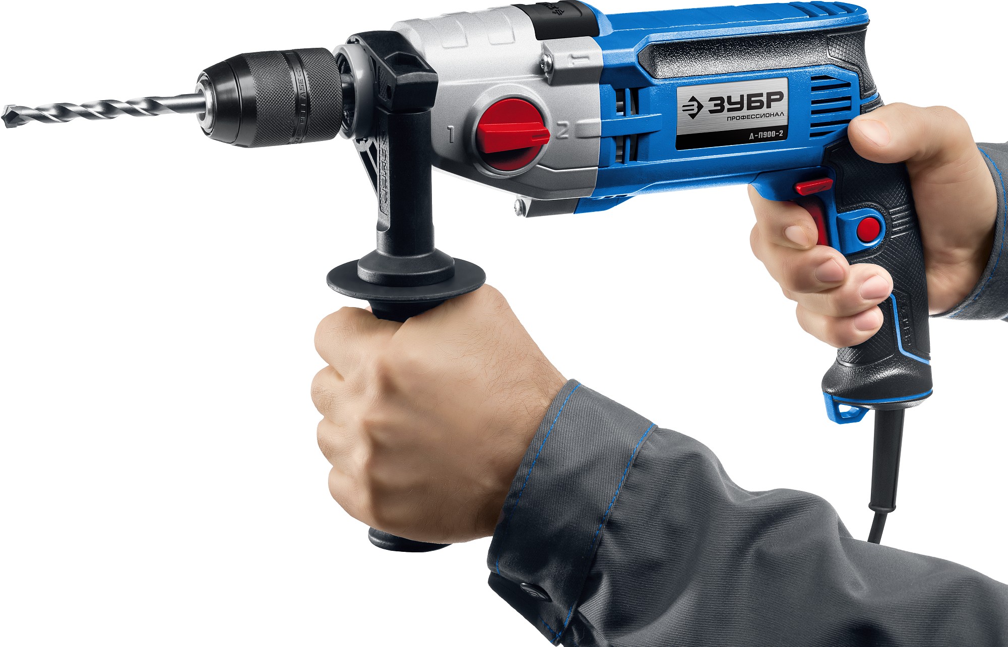 Универсальный инструмент для сверления отверстий в различных материалах (дерево, сталь и т. д.). Профессиональная дрель с мощным двигателем, двумя скоростными диапазонами, продуманной эргономикой и удобной дополнительной рукояткой
