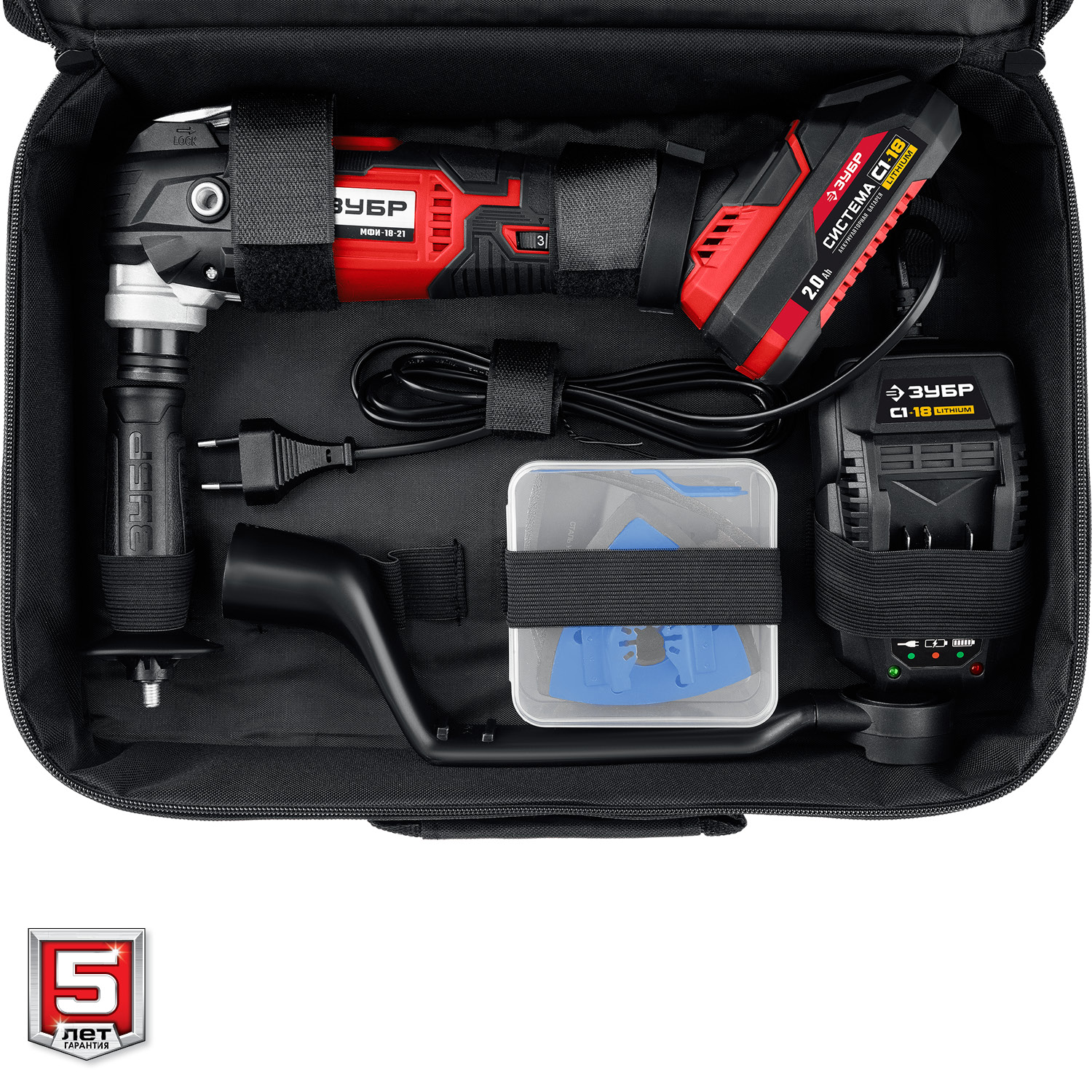 Реноватор аккумуляторный ЗУБР - универсальное устройство для разных строительных работ (резка, шлифование), особенно в труднодоступных местах и в отсутствие доступа к электричеству. Большой угол колебаний 3 градуса в сочетании с широким спектром регулировки частоты обеспечивают эффективную работу с любым материалом. Расширенная комплектация включает в себя базовый набор насадок для начала работы сразу после покупки и удобную сумку для хранения и переноски