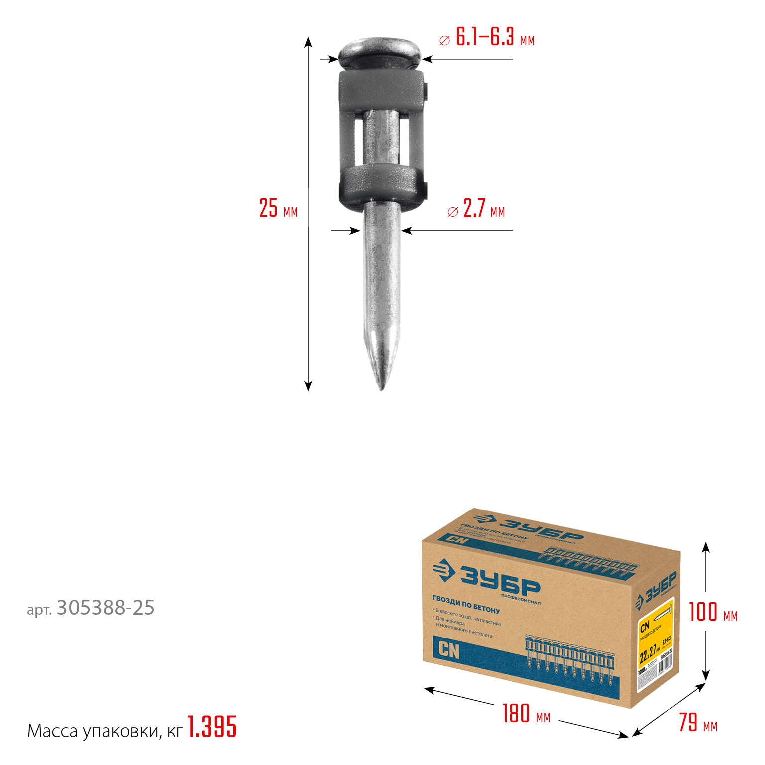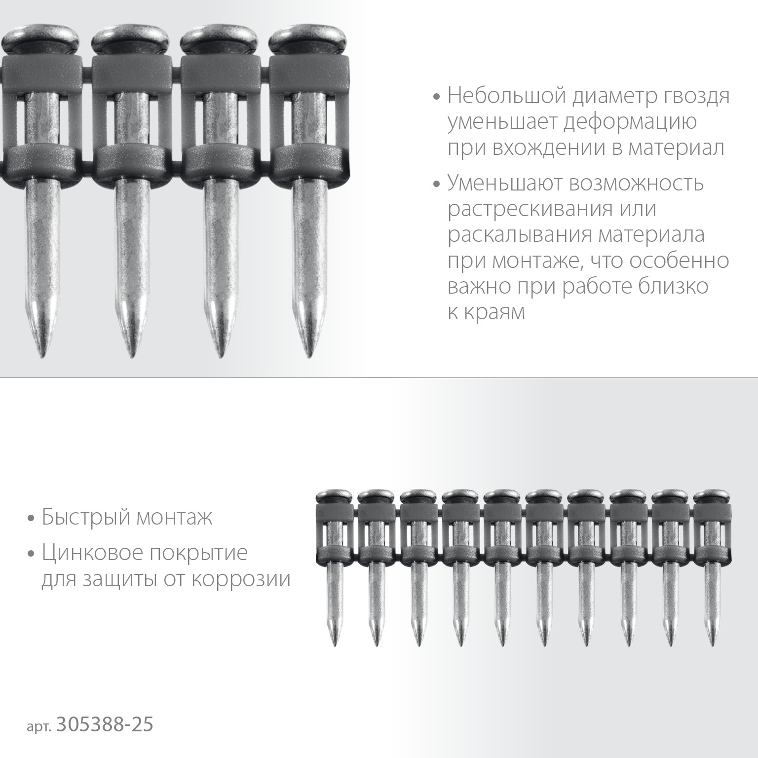 Гвозди по бетону соединены в кассету и забиваются при помощи газового или пневматического гвоздезабивного пистолета (нейлера). Необходимый размер гвоздя подбирается в зависимости от монтируемых материалов.