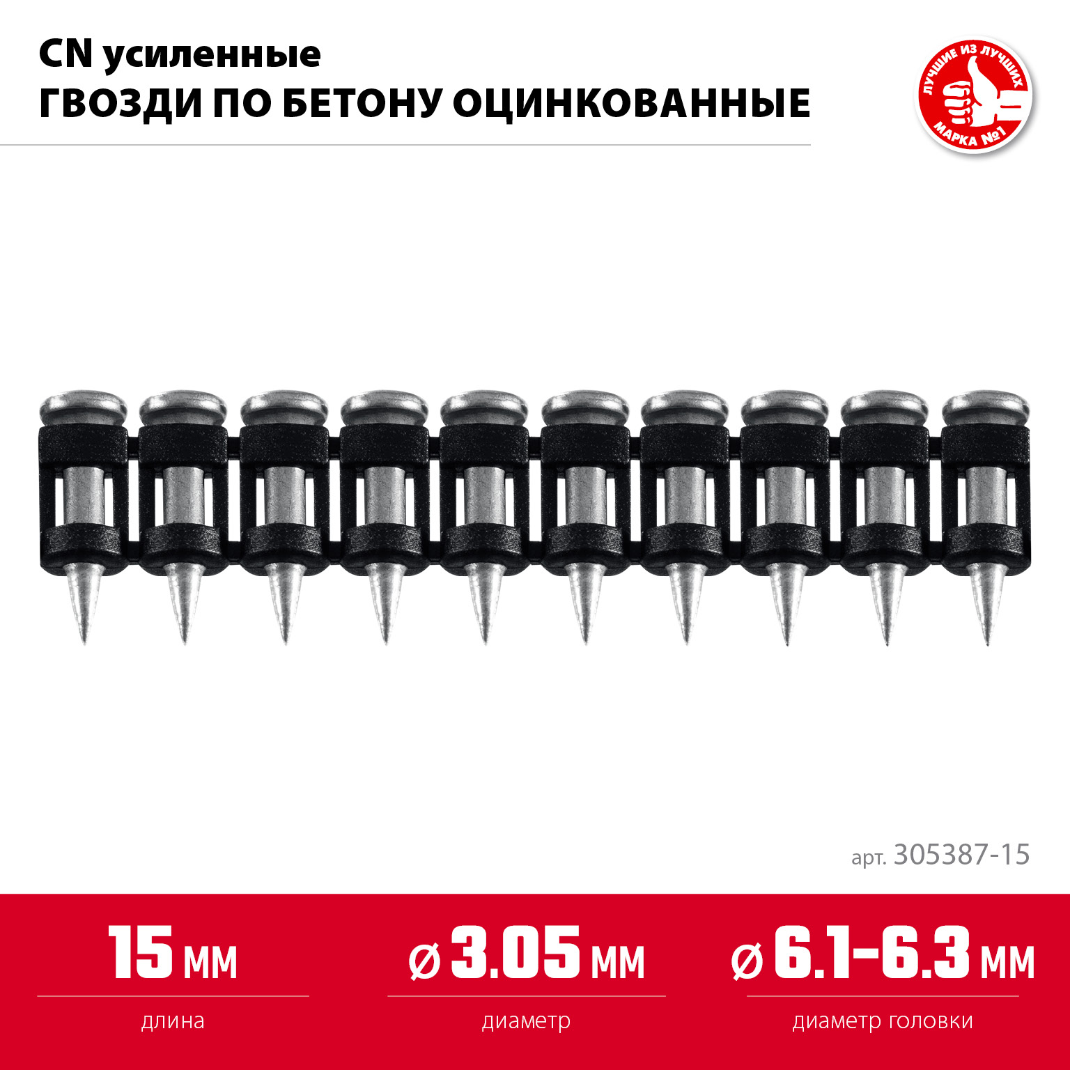 Усиленные гвозди по бетону соединены в кассету и забиваются при помощи газового или пневматического гвоздезабивного пистолета (нейлера). Кованый наконечник пулевидной формы облегчает вхождение в высокопрочные материалы.