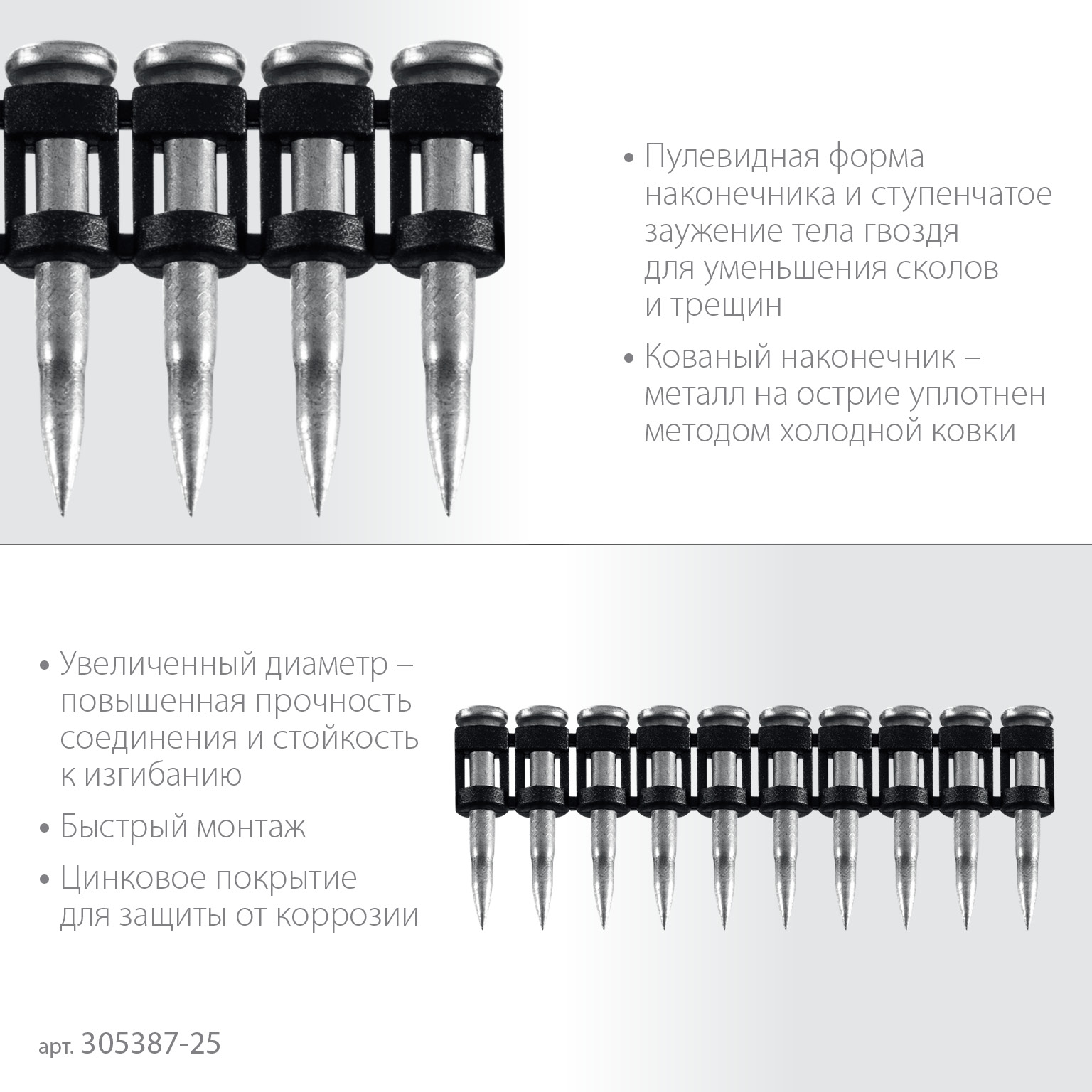 - Пулевидная формы наконечника и ступенчатое заужение тела гвоздя до 2,7 мм повышают качество работ за счет уменьшения сколов и трещин.
