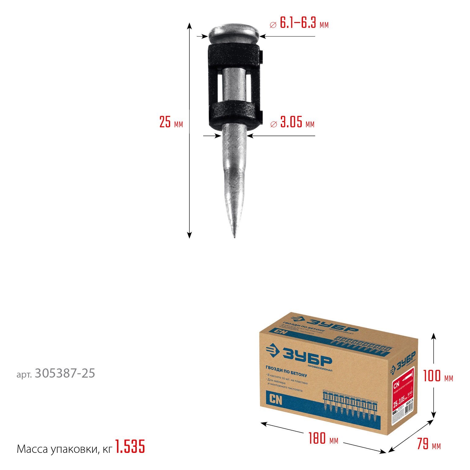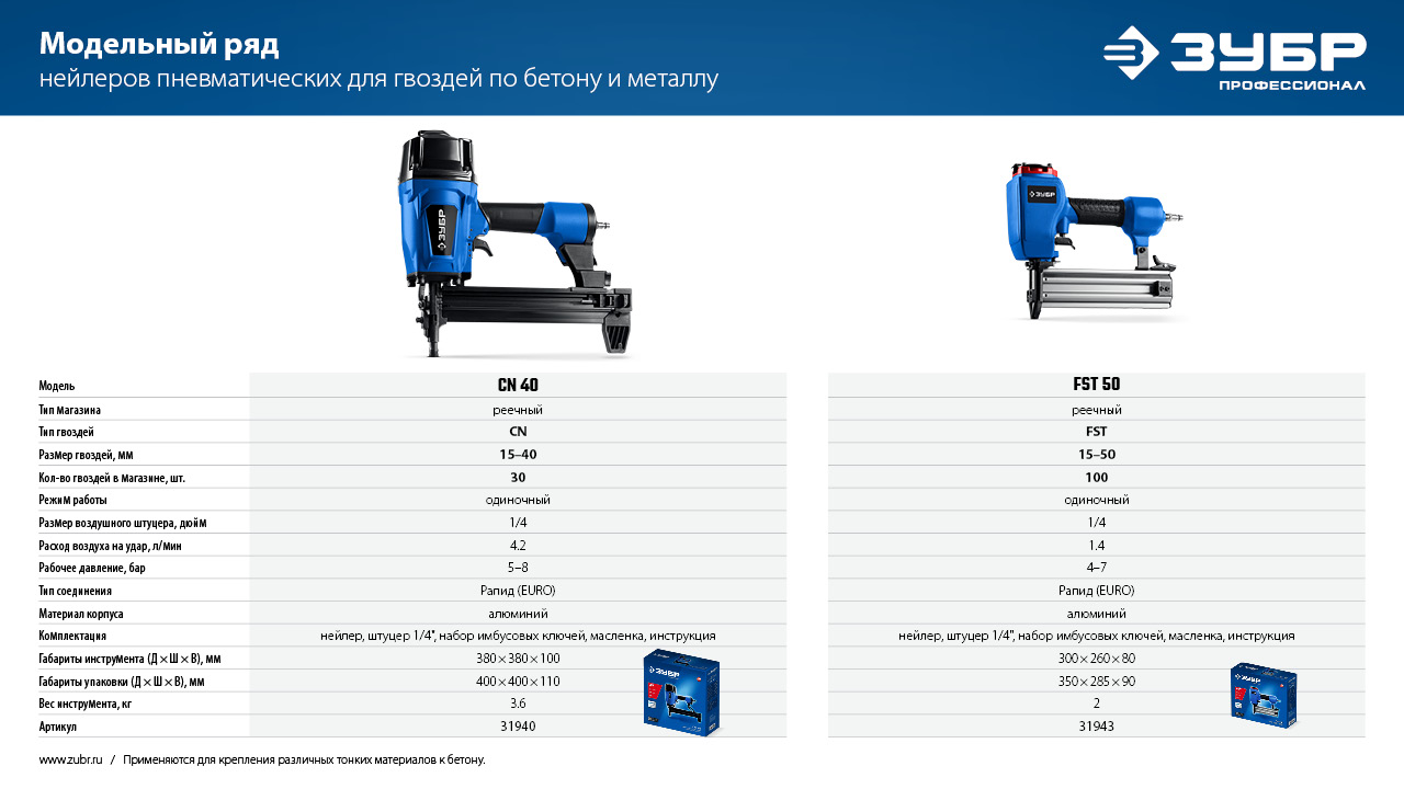 Усиленные гвозди по бетону соединены в кассету и забиваются при помощи газового или пневматического гвоздезабивного пистолета (нейлера). Кованый наконечник пулевидной формы облегчает вхождение в высокопрочные материалы.