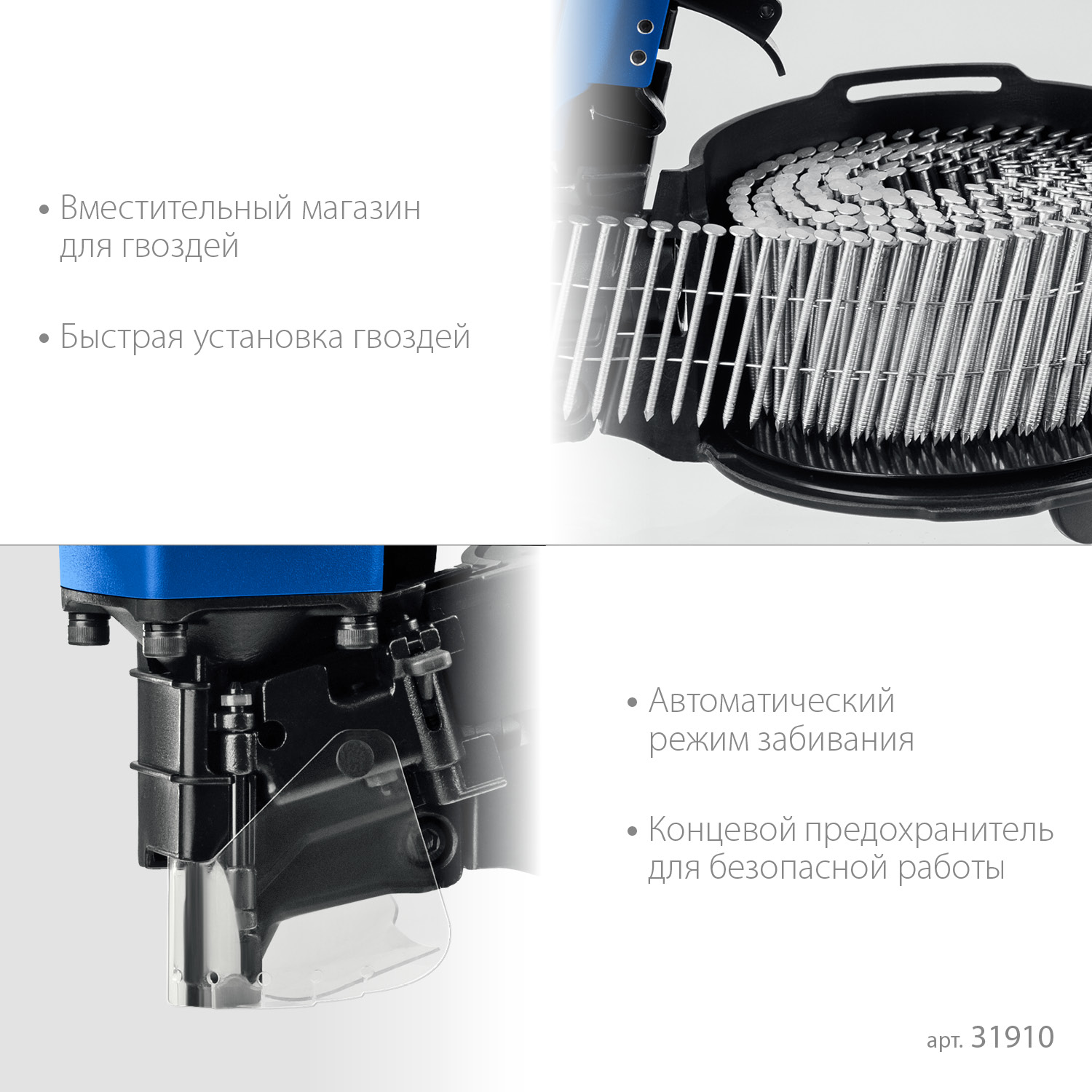 Нейлер пневмоинструмент предназначен для производства паллет (поддонов) и других изделий из дерева, таких как тара, ящики и упаковка с гвоздями длиной 35-57мм барабанного типа.