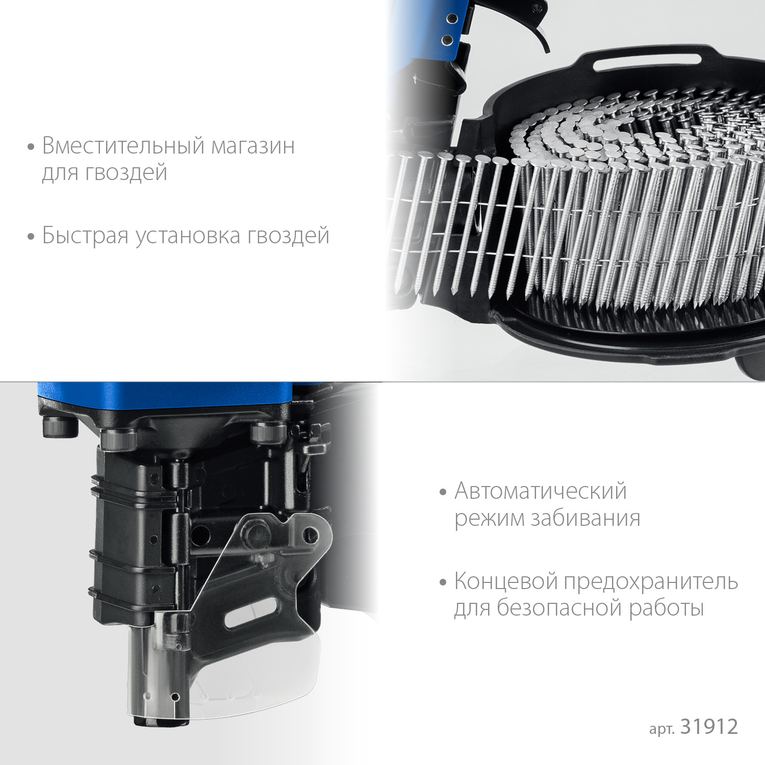 Нейлер пневмоинструмент предназначен для производства паллет (поддонов) и других изделий из дерева, таких как тара, ящики и упаковка с гвоздями длиной 45-70мм барабанного типа.