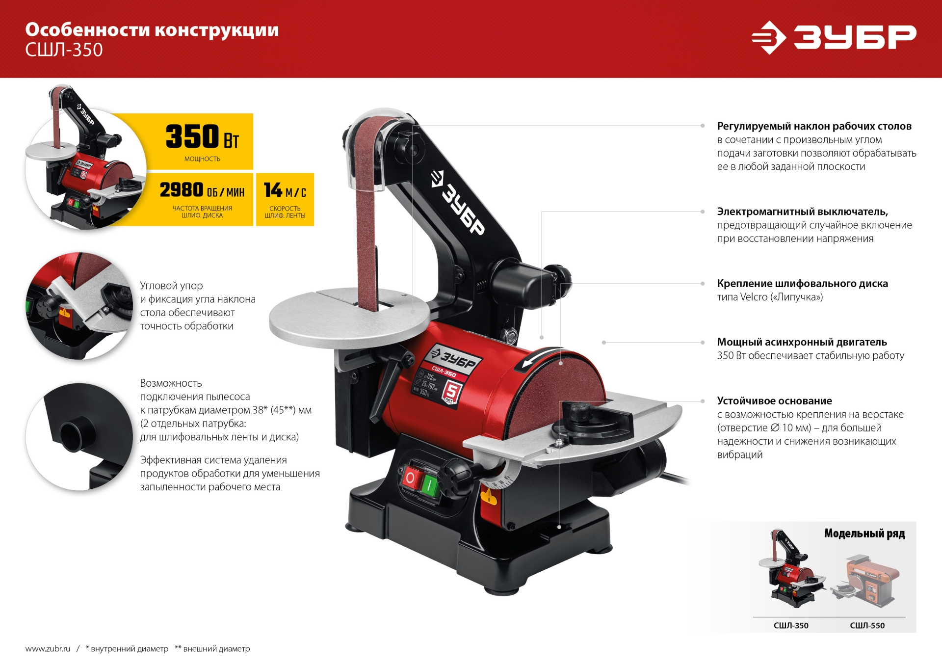 ЗУБР d 125 мм, 25 х 762 мм лента, 350 Вт, тарельчато - ленточный шлифовальный станок (СШЛ-350)