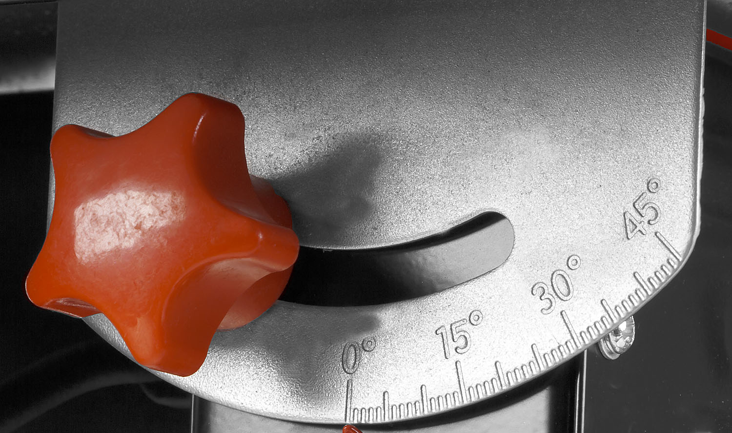 - Защитный кожух диска автоматически откидывается при подаче заготовки и защищает оператора от травм и повреждений
