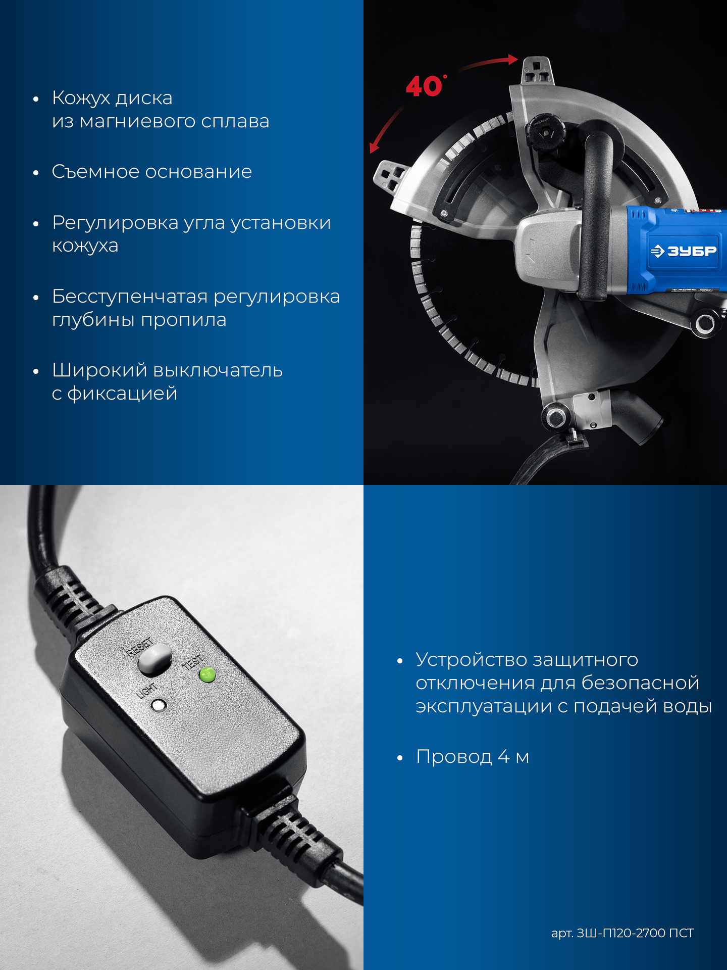 - Эффективное пылеудаление благодаря возможности подключения пылесоса (диаметр подключения 40мм, совместимо с пылесосами ЗУБР серии ПУ-хх)