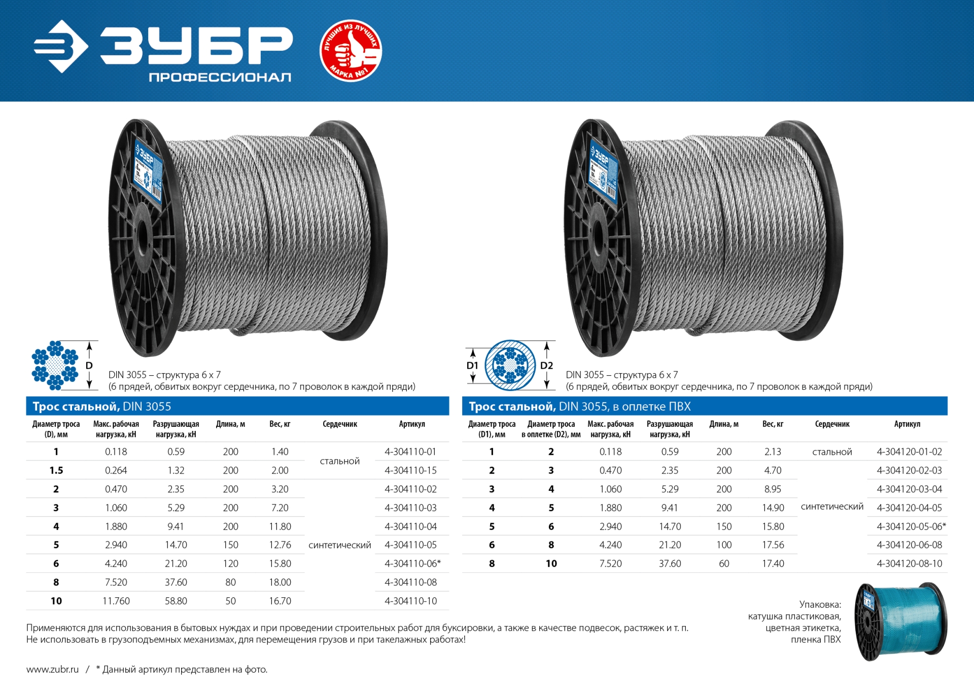 ЗУБР DIN 3055, свивка 6 x 7 + FC, 10 мм, L 50 м, стальной трос, Профессионал (4-304110-10)