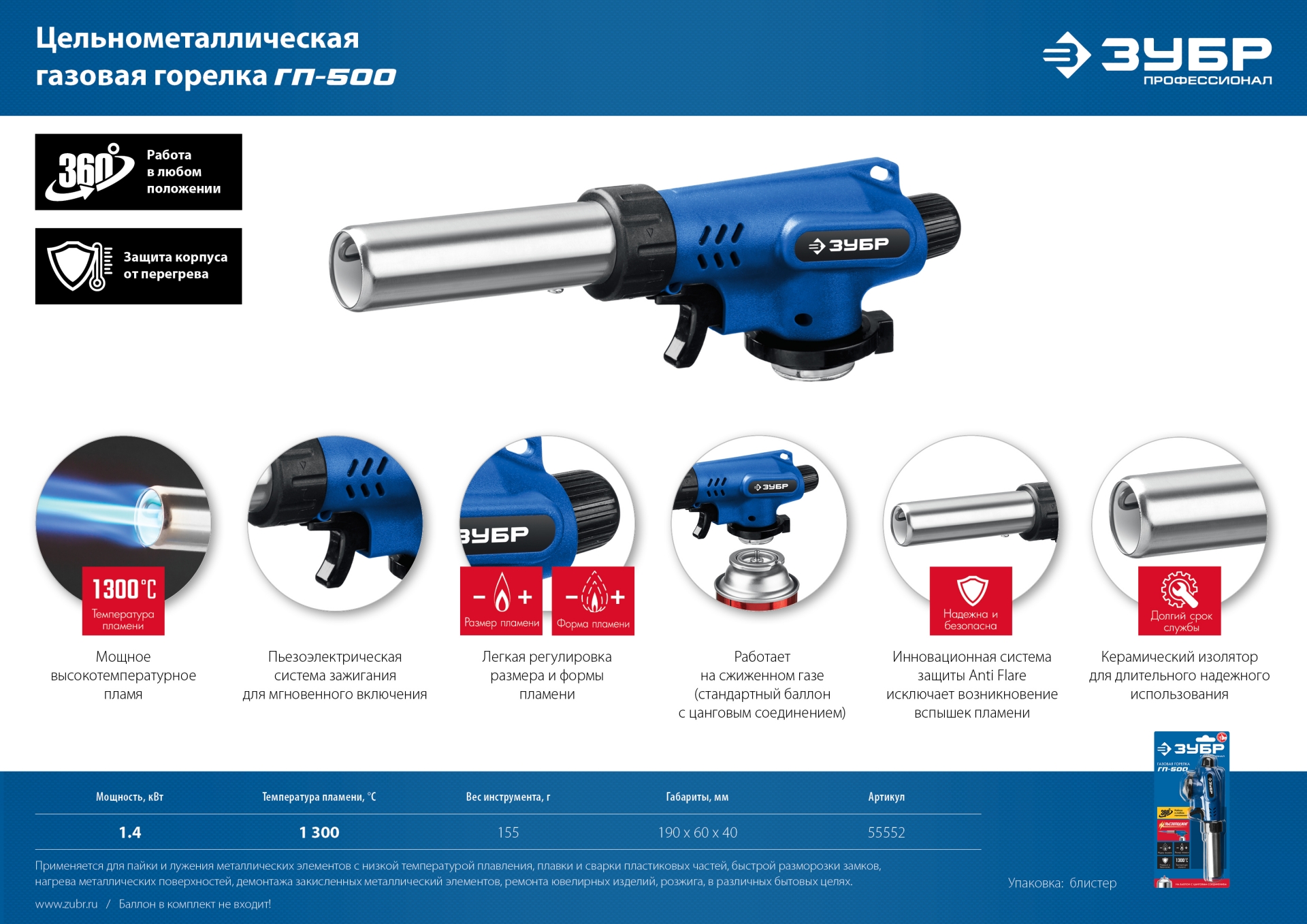 Газовая горелка предназначена для плавки и сварки пластиковых частей, нагрева малых металлических частей и плавки металла с низкой температурой плавления, ремонта ювелирных изделий, сгибания тонких стеклянных трубок, пайки медных трубок, сварки электронных и электротехнических элементов, где очень важна точность и надежность. Изделие обладает возможностью выбора температурного режима, что позволяет максимально соответствовать требованиям любой работы. Этот легкий в обращении инструмент, работающий на бутане. Работает от баллона с бутаном с цанговым соединением. Создает устойчивое пламя температурой до 1300 °С.