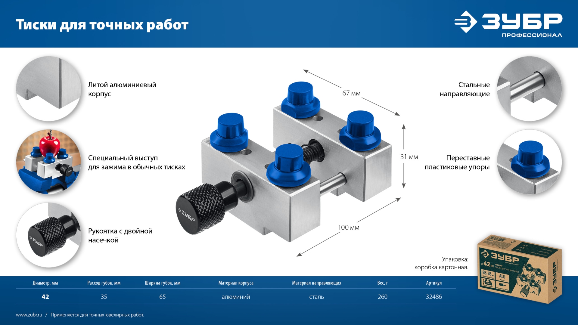 Профессиональные тиски ЗУБР ЮВЕЛИР для точных работ. Идеальный инструмент для бережной фиксации ювелирных изделий диаметром до 42 мм. Переставные пластиковые упоры позволяют зажимать изделия различной формы. Зажим деталей пралельными губками без использования упоров. Литой алюминиевый корпус. Специальный выступ на основании для зажима в обычных тисках. Зажимной винт и направляющие из качественной стали для точного хода. Двойная насечка на ручке для максимального удобства.