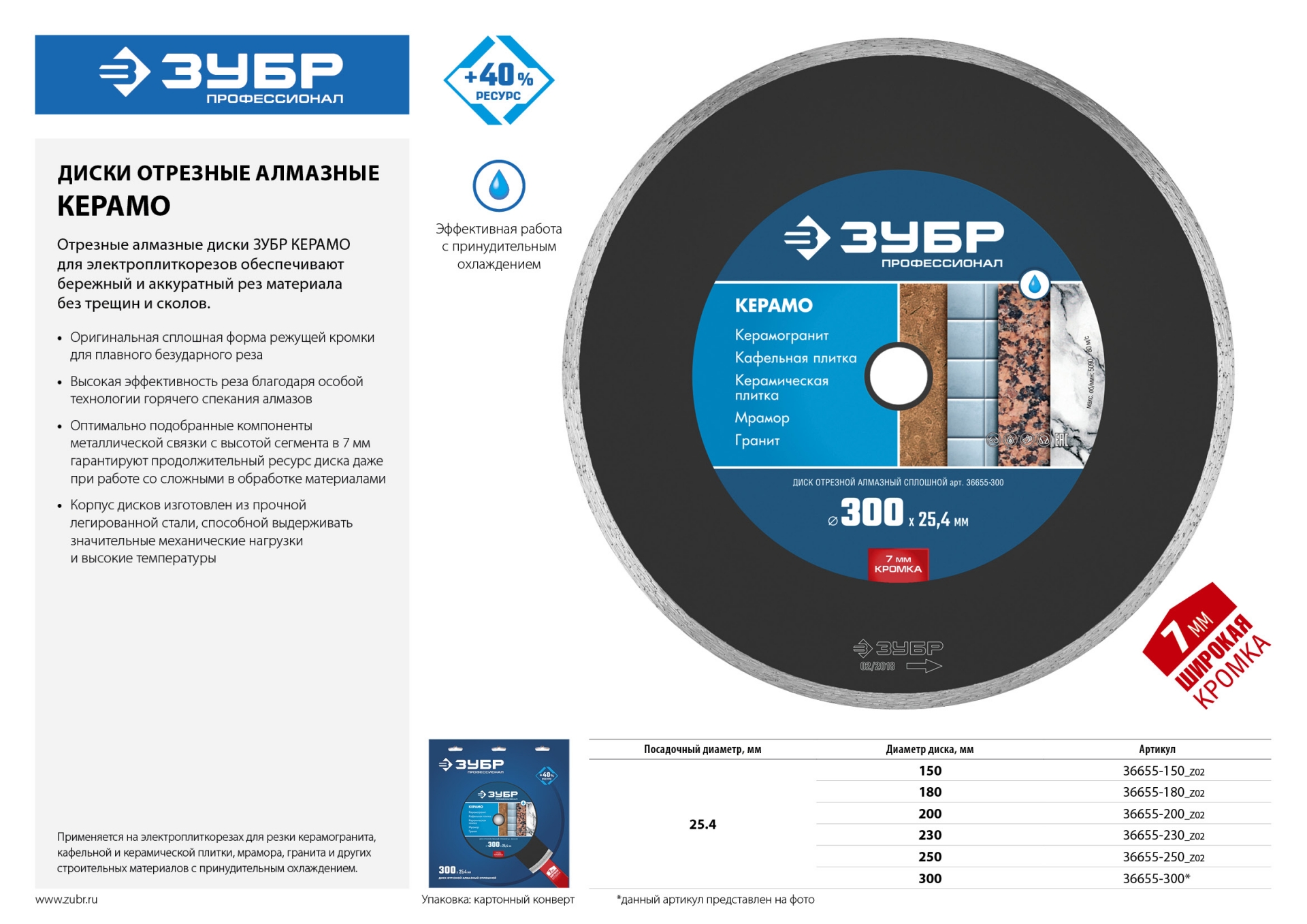 Исключительно высокий уровень качества отрезных алмазных дисков ЗУБР гарантирован комплексной системой контроля всего процесса производства: от качества поступающего сырья до готовой продукции. Корпуса алмазных дисков изготовлены из прочной легированной стали, способной выдержать значительную механическую нагрузку и высокую температуру.