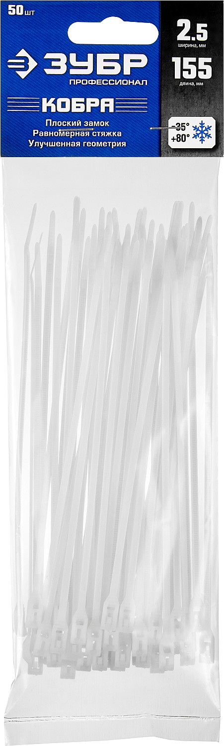 ЗУБР КОБРА, 2.5 x 155 мм, нейлон РА66, 50 шт, белые, кабельные стяжки с плоским замком, Профессионал (30930-25-155)