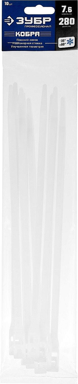 ЗУБР КОБРА, 7.6 x 280 мм, нейлон РА66, 10 шт, белые, кабельные стяжки с плоским замком, Профессионал (30930-76-280)
