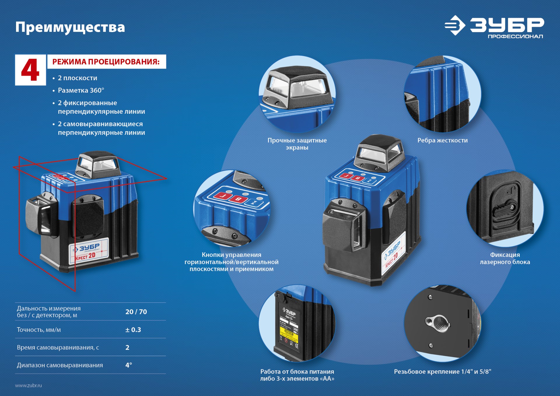 - 2 режима проецирования линий: горизонтальная и две вертикальные линии с развёрткой 360°, благодаря чему луч будет виден в любой точке.