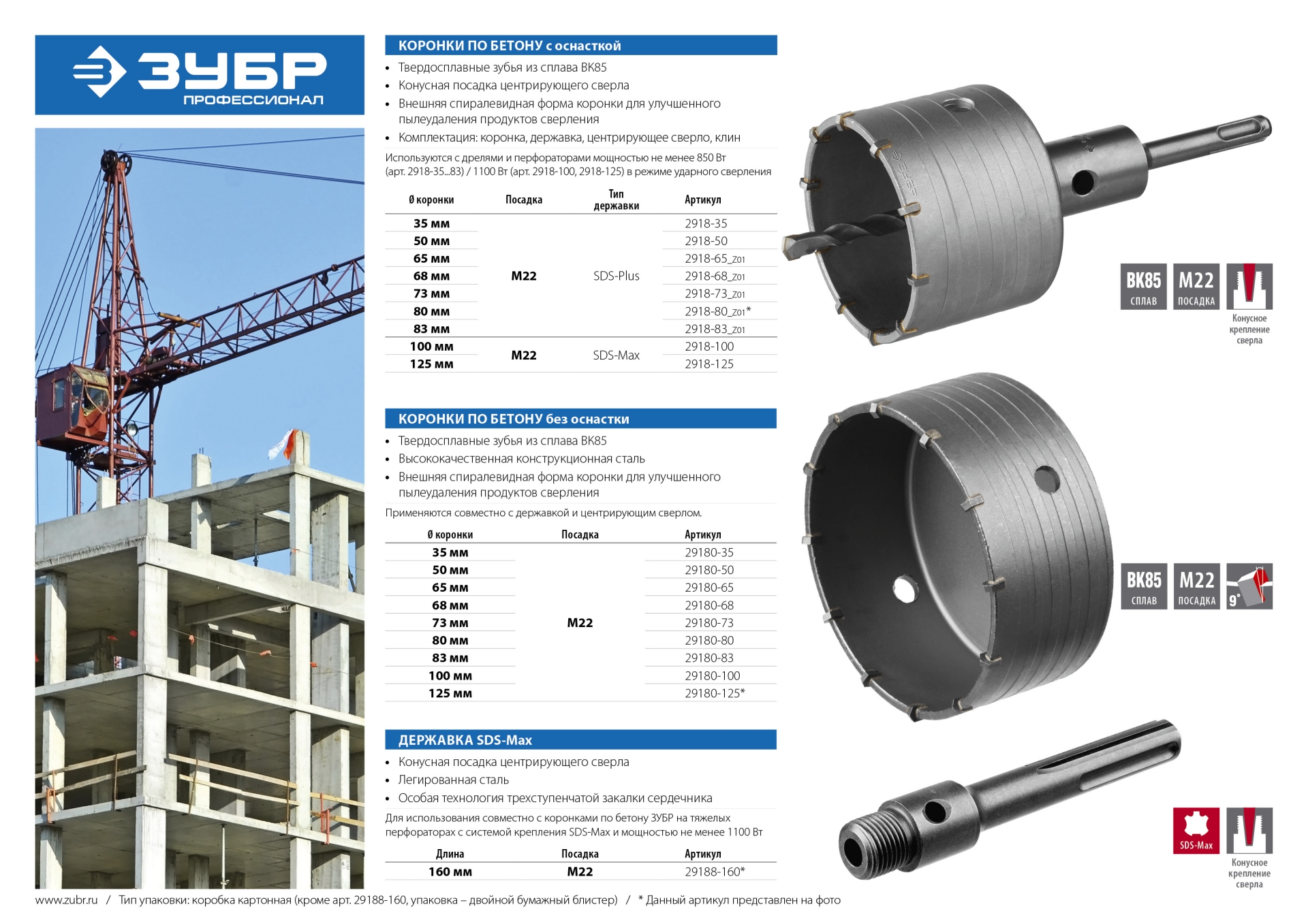Коронки по бетону используются совместно с державками и центрирующими сверлами. Широкий ассортимент оснастки ЗУБР позволяет реализовать самые сложные задачи в работе по бетону, камню и кирпичу.