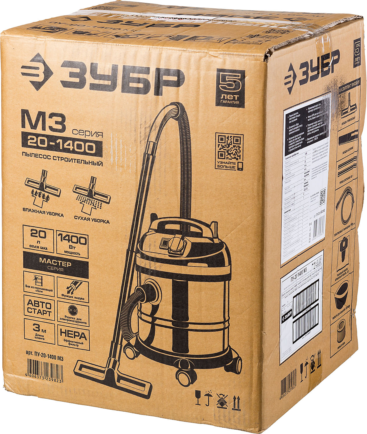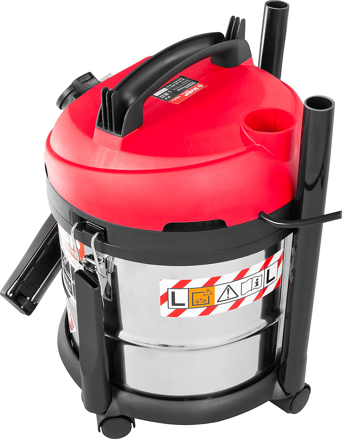 Строительный пылесос ЗУБР предназначен для уборки помещений, а также для принудительного удаления продуктов пиления, строгания, фрезерования и т.п. из рабочей зоны электроинструмента. Он незаменим для поддержания чистоты в гараже, мастерской, удаления мусора во время ремонта в квартире или на даче. Бак из нержавеющей стали объемом 20 л очень долговечен. а синхронное включение с инструментом, подключенным через розетку пылесоса позволит сохранить чистоту на рабочем месте.