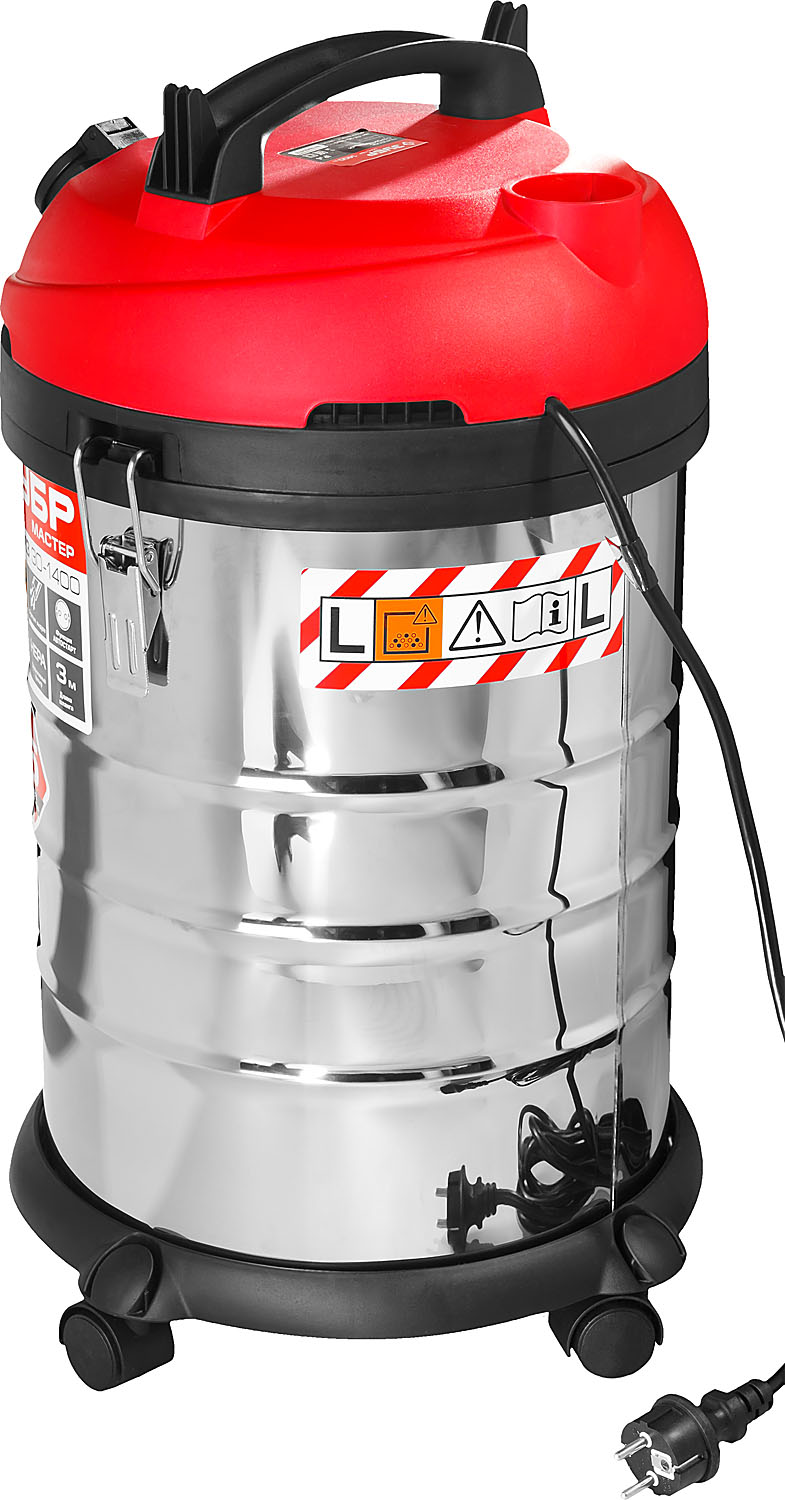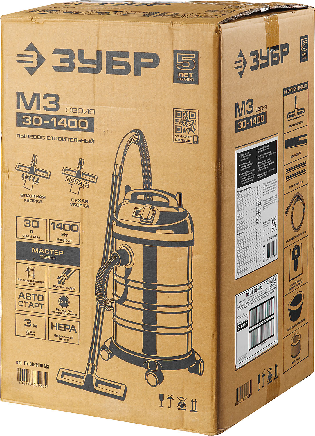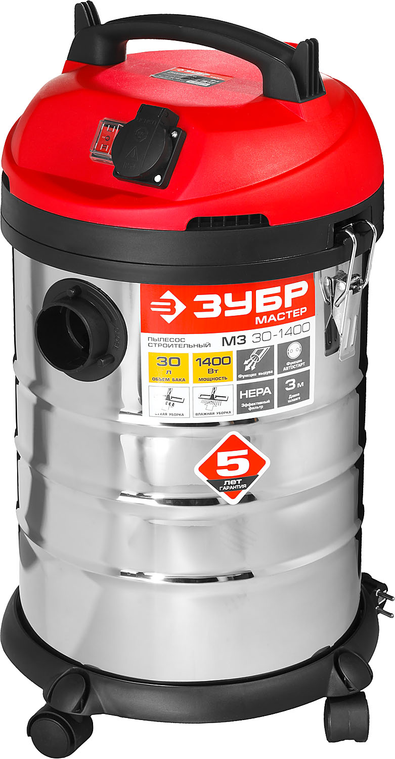 Строительный пылесос ЗУБР предназначен для уборки помещений, а также для принудительного удаления продуктов пиления, строгания, фрезерования и т.п. из рабочей зоны электроинструмента. Он незаменим для поддержания чистоты в гараже, мастерской, удаления мусора во время ремонта в квартире или на даче. Бак из нержавеющей стали объемом 30 л очень долговечен. а синхронное включение с инструментом, подключенным через розетку пылесоса позволит сохранить чистоту на рабочем месте.