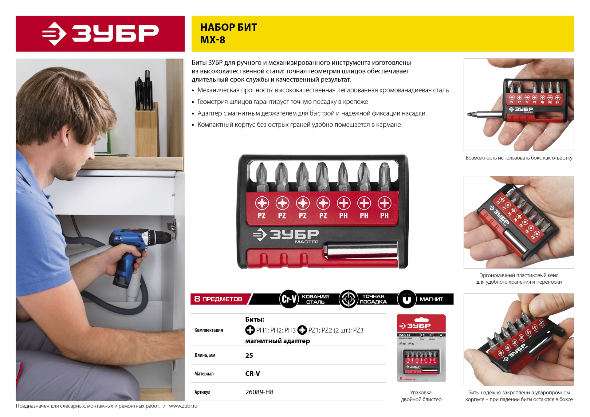 Набор бит Зубр предназначен для монтажа и демонтажа резьбовых соединений.