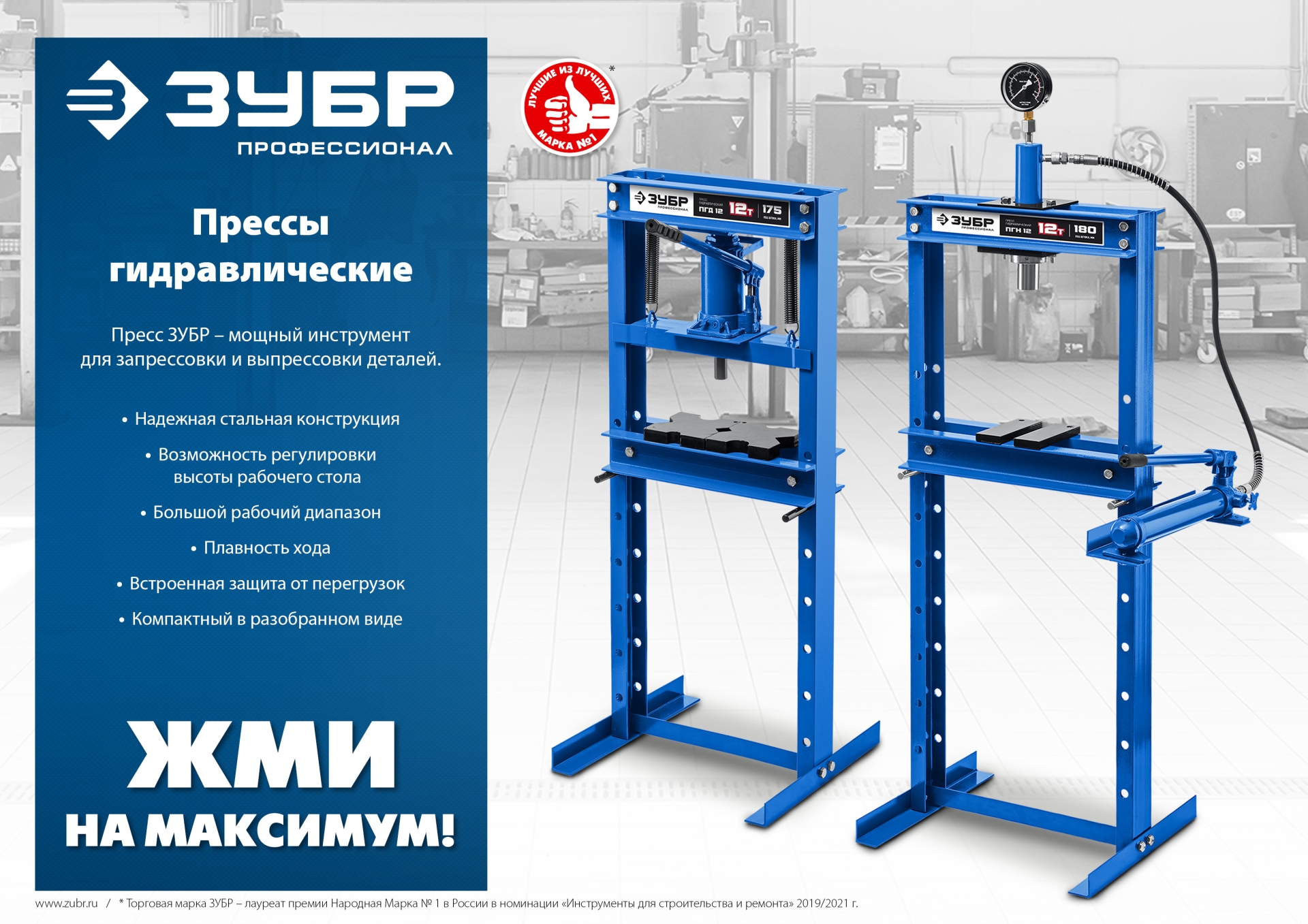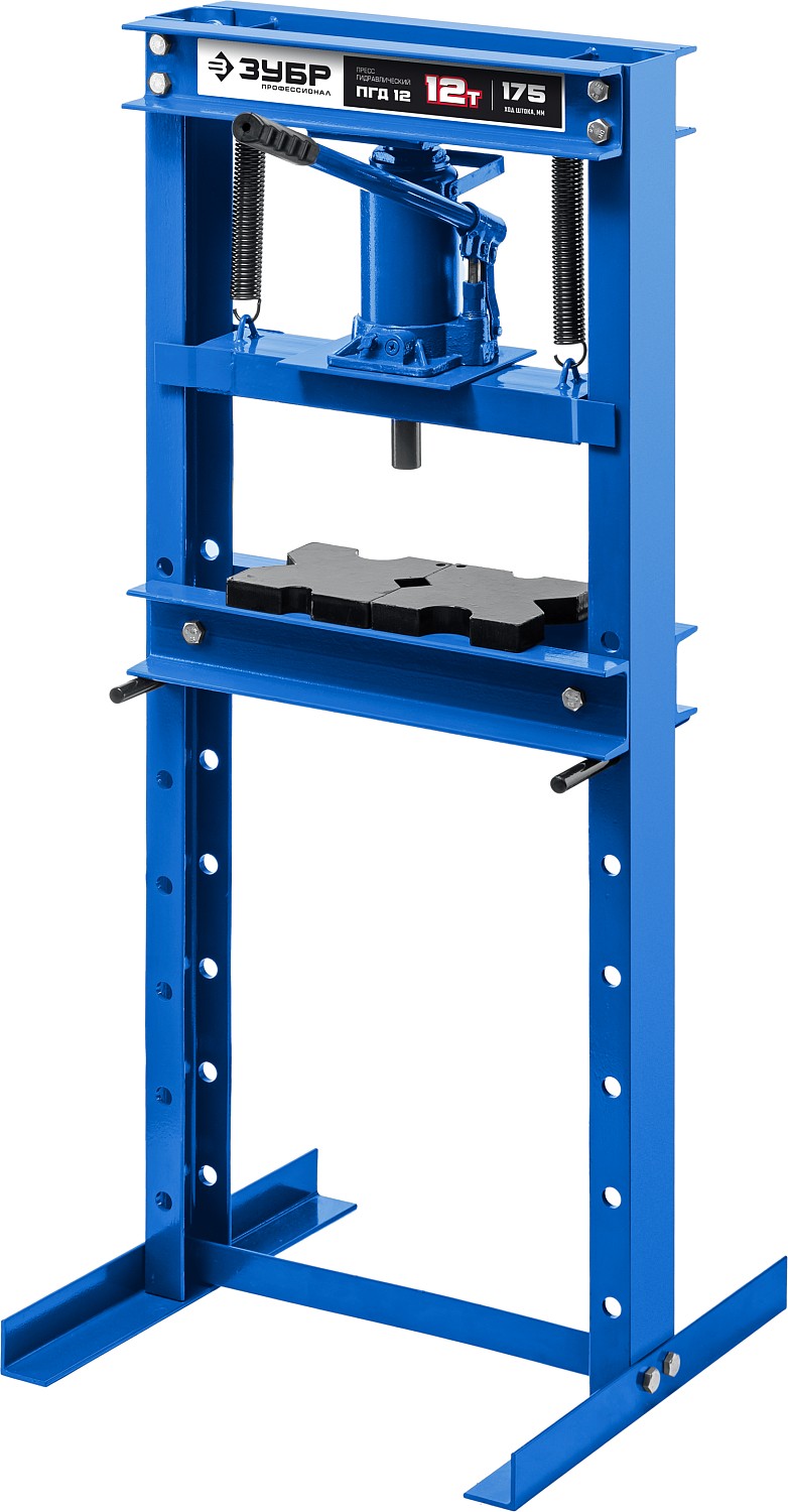 Пресс ЗУБР - мощный инструмент для запрессовки деталей. Отличается прочной металлической конструкцией. Широкое Н-образное основание надежно крепится к полу анкерными болтами. Силовым элементом пресса является домкрат, который при работе опускает подъемную платформу и запрессовывает деталь