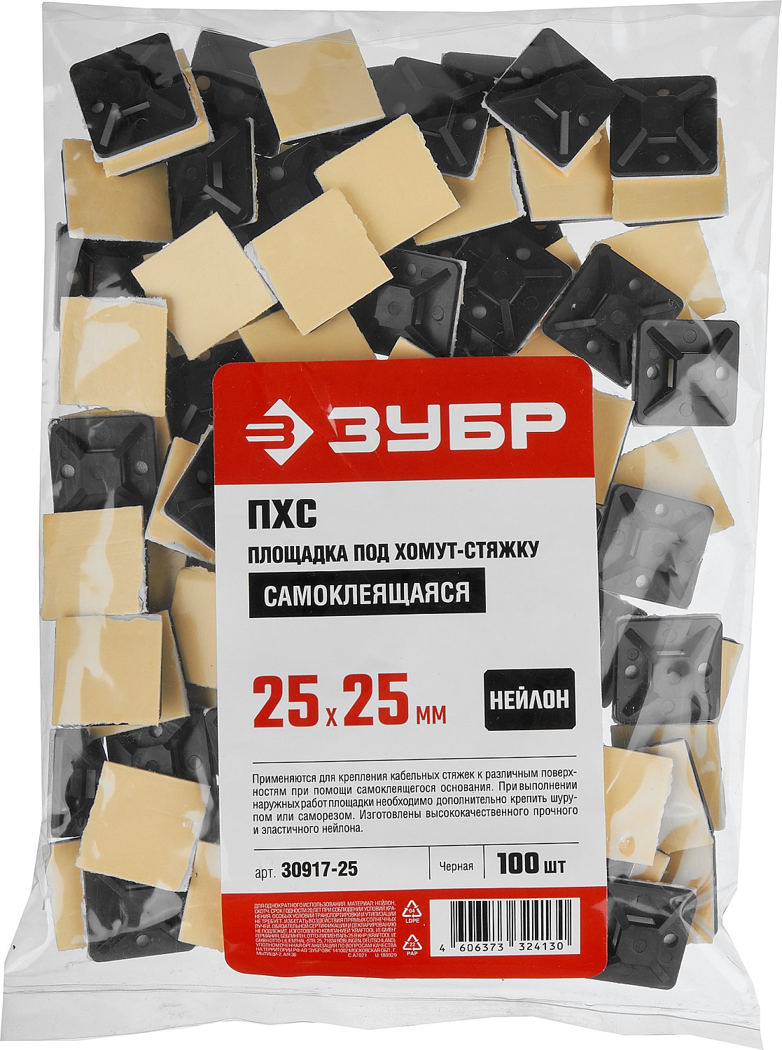 ЗУБР ПХС, 25 x 25 мм, нейлон, 100 шт, черная, самоклеющаяся площадка под хомут-стяжку (30917-25)