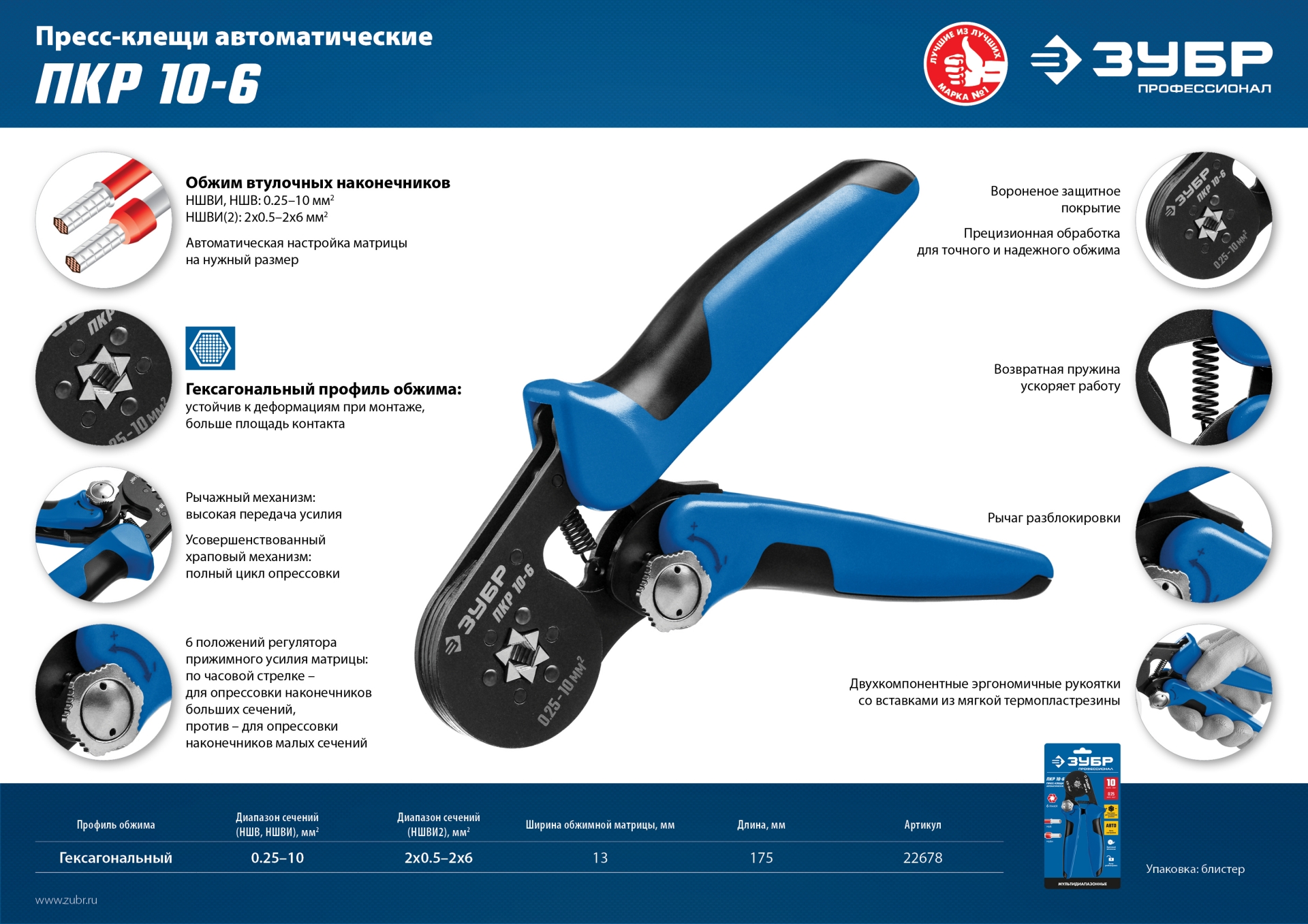 - Обжим изолированных и неизолированных втулочных наконечников 0.5-10 мм2.