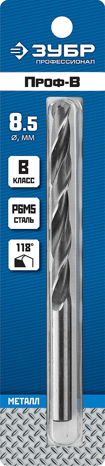 ЗУБР ПРОФ-В, 8.5 х 117 мм, сталь Р6М5, класс В, сверло по металлу, Профессионал (29621-8.5)