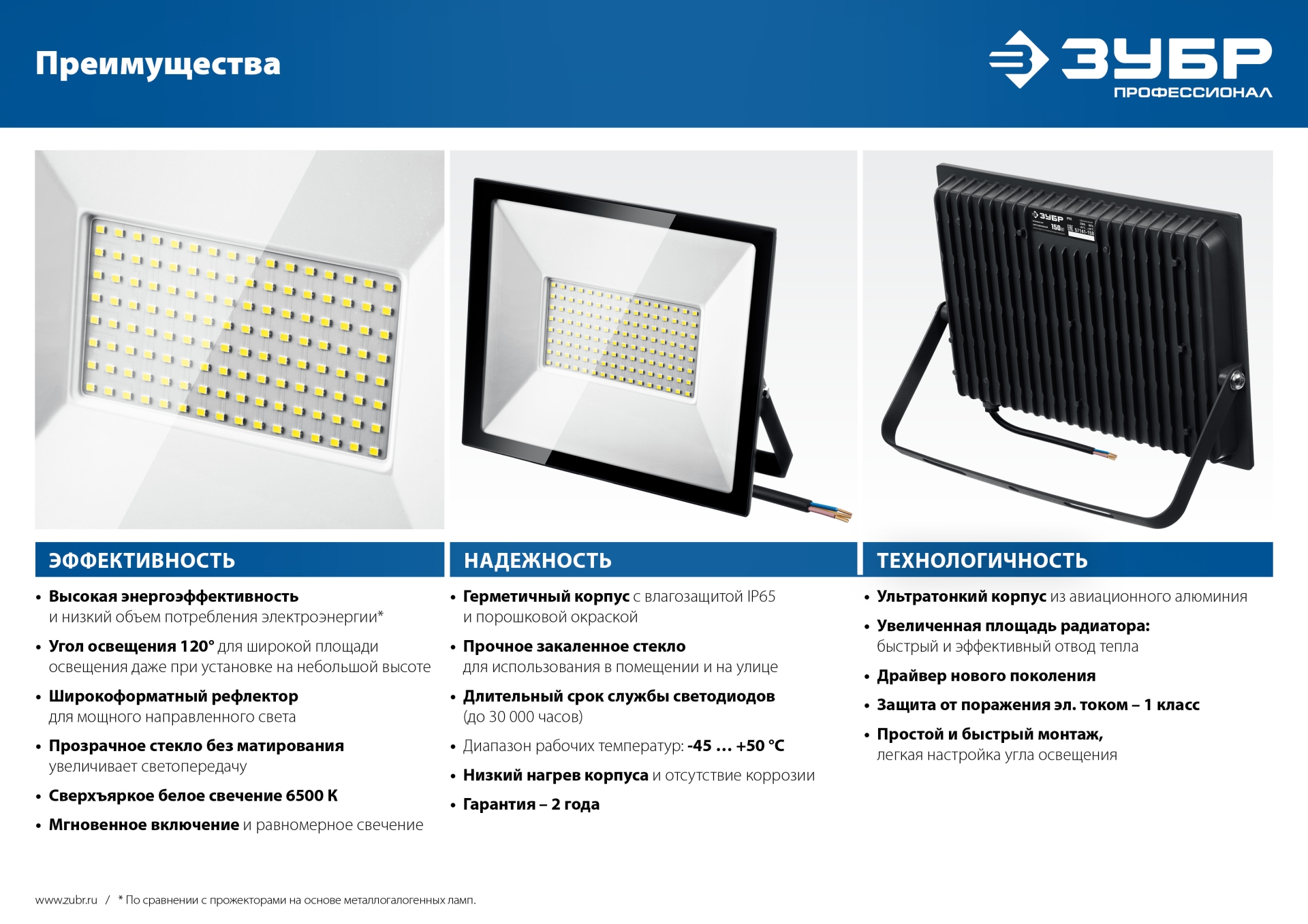 Прожекторы ЗУБР предназначены для подсветки зданий, сооружений, памятников, рекламных щитов, а также для освещения парковок, стадионов и других объектов. Благодаря ударопрочному корпусу, термостойкому стеклу и высокому классу электрозащиты эти изделия можно использовать на улице в любую погоду.