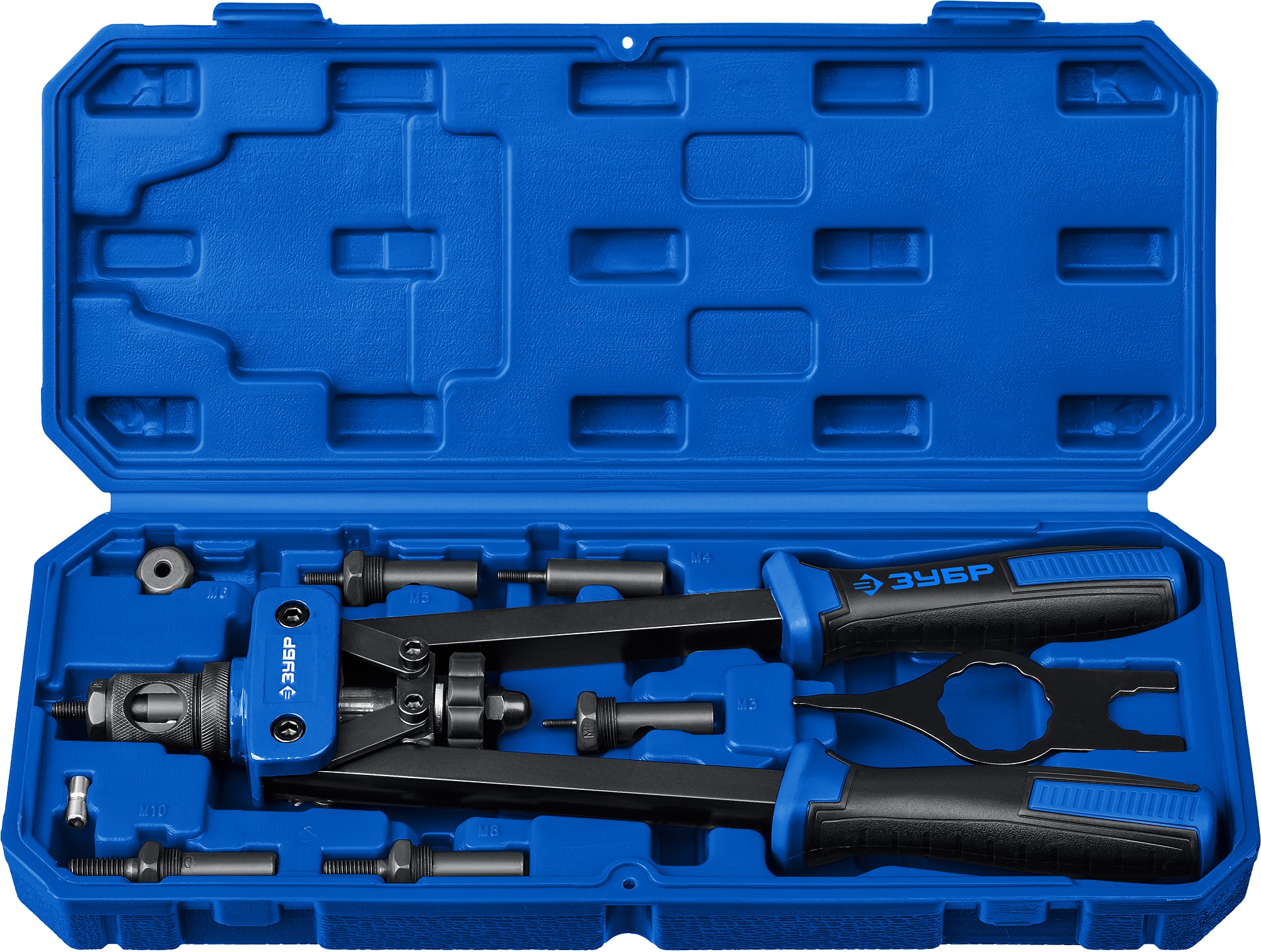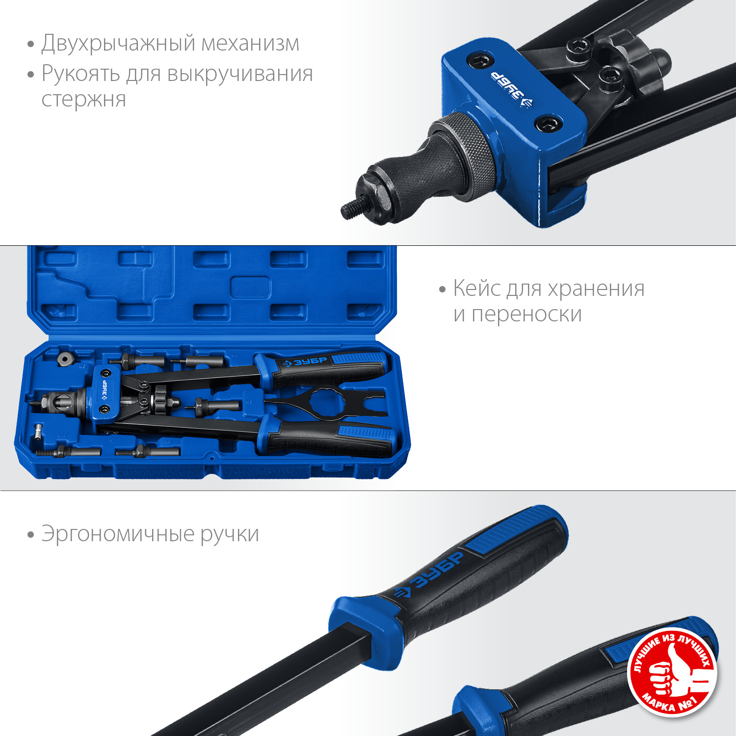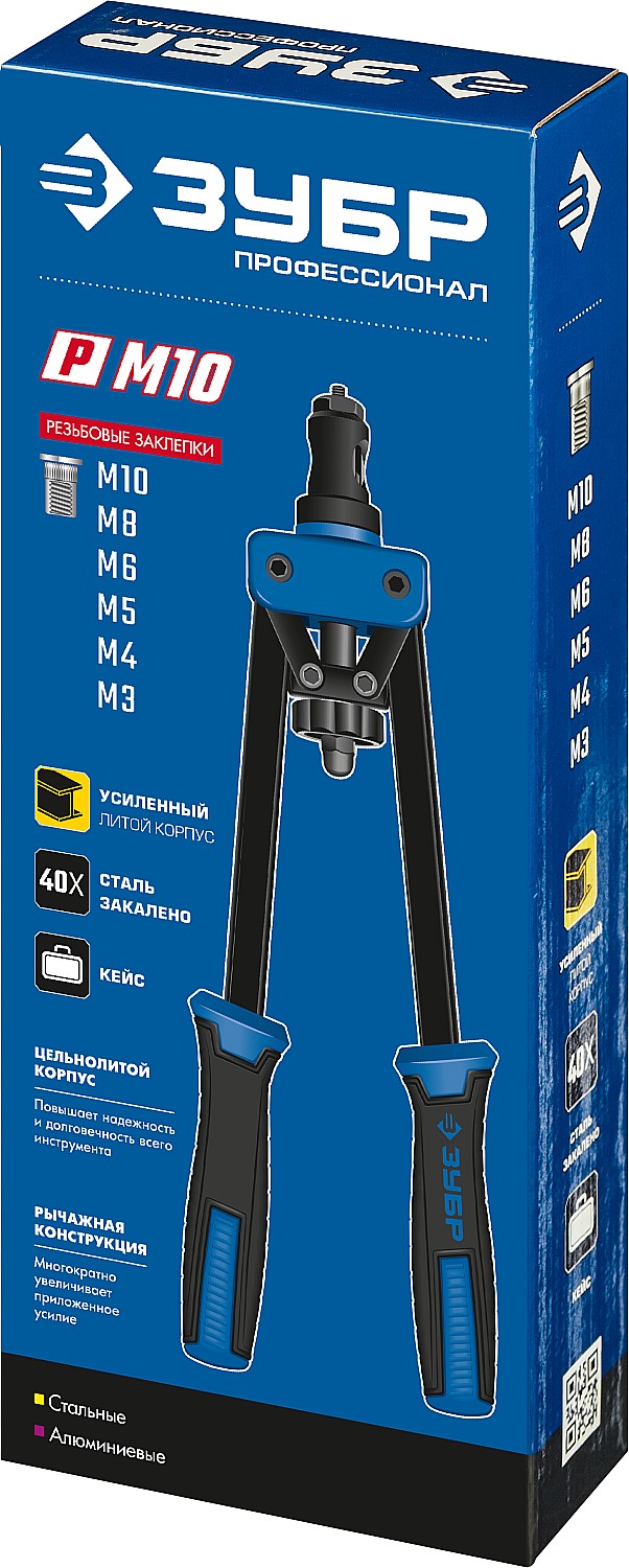 Надежный инструмент для работы со стальными и алюминиевыми резьбовыми заклепками. Двухрычажная конструкция корпуса значительно облегчает работу.