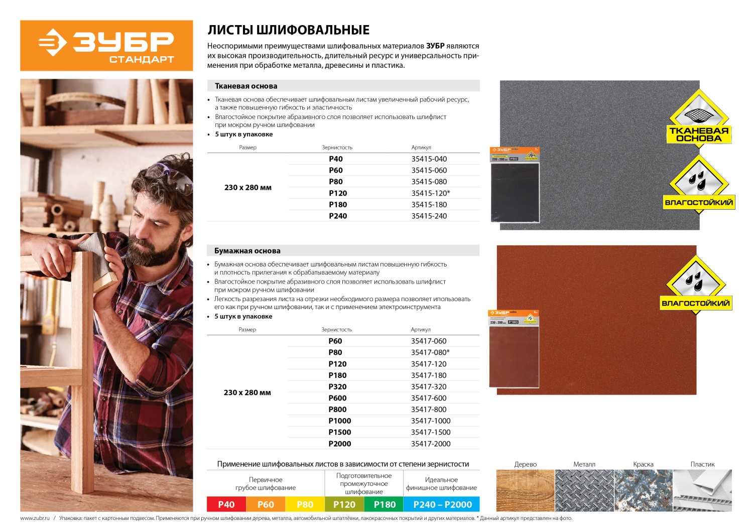 Неоспоримыми преимуществами шлифовальных материалов ЗУБР является их высокая производительность, длительный ресурс и универсальность применения при обработке металла, древесины и пластика.