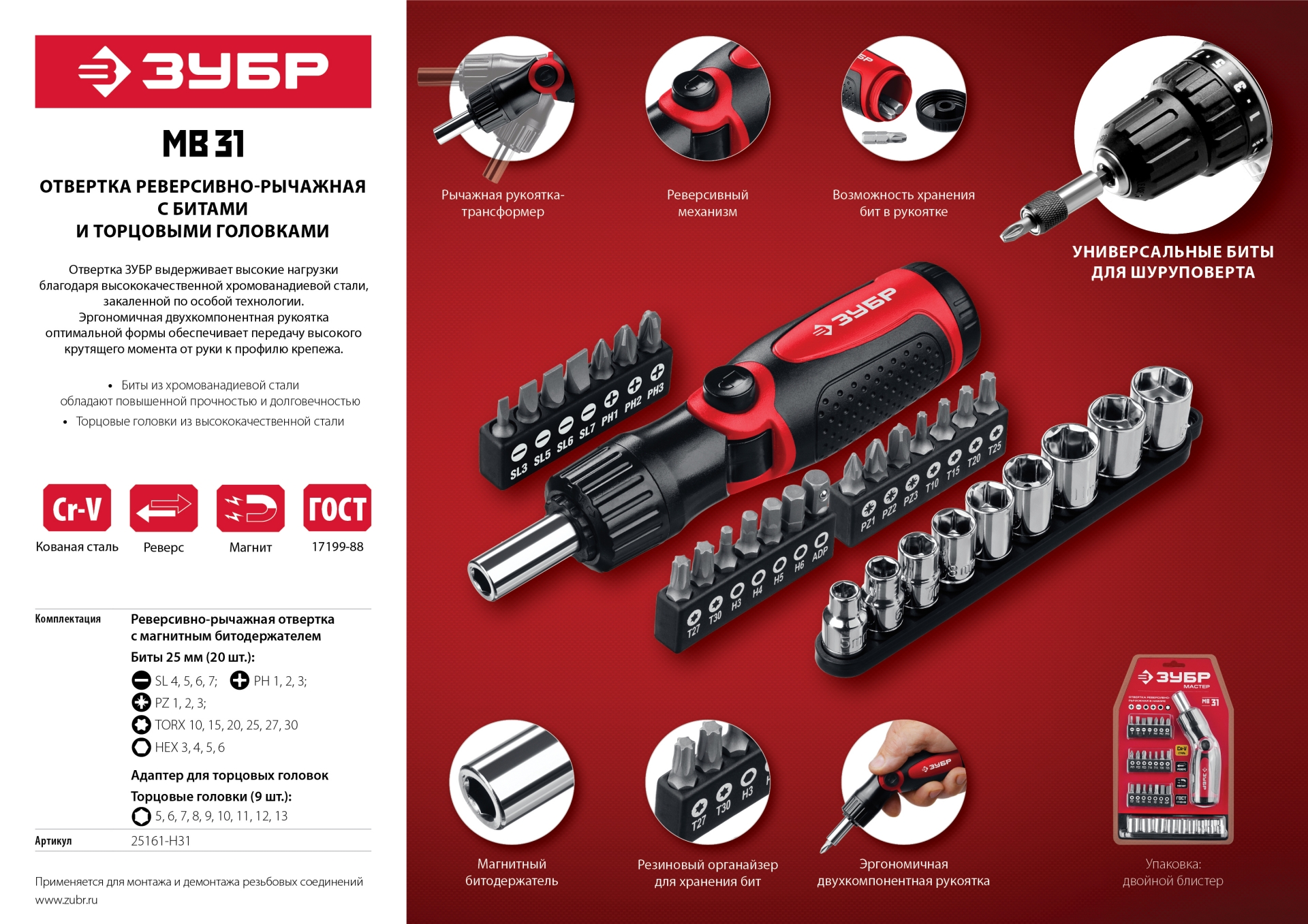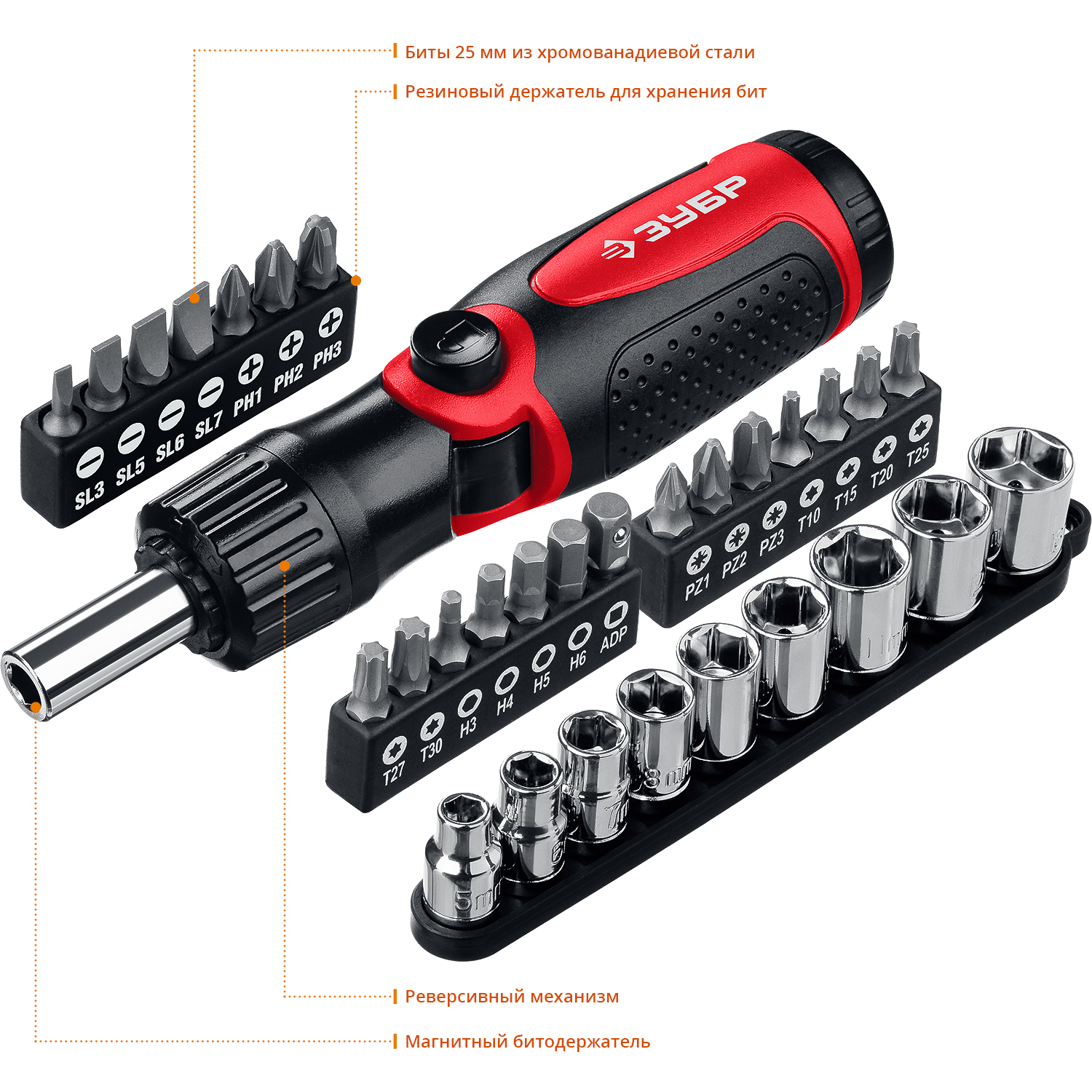 Набор бит и головок с реверсивной отверткой изготовлен из высококачественной стали. Универсальность набора позволяет использовать как самостоятельно, так и в дополнении к шуруповерту.