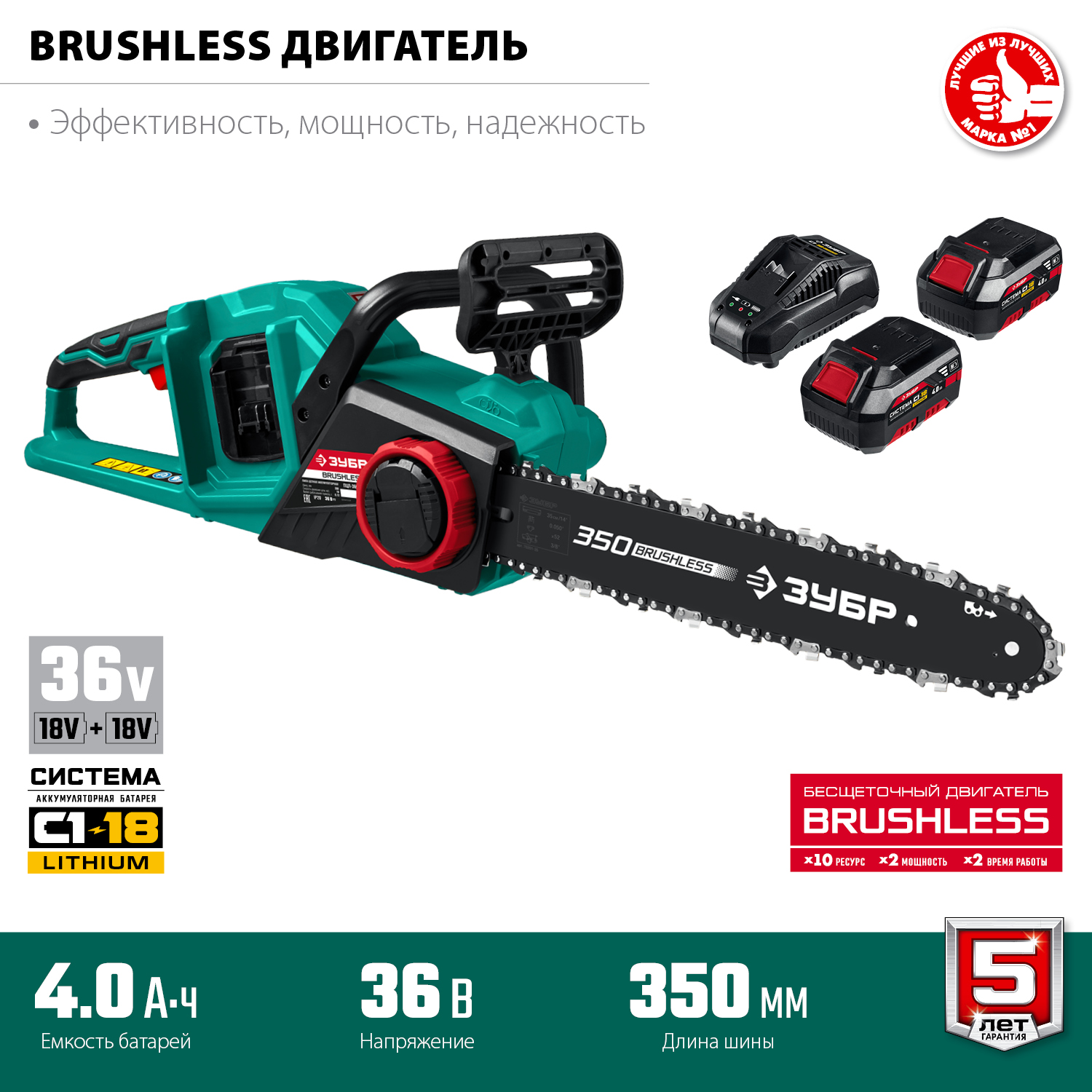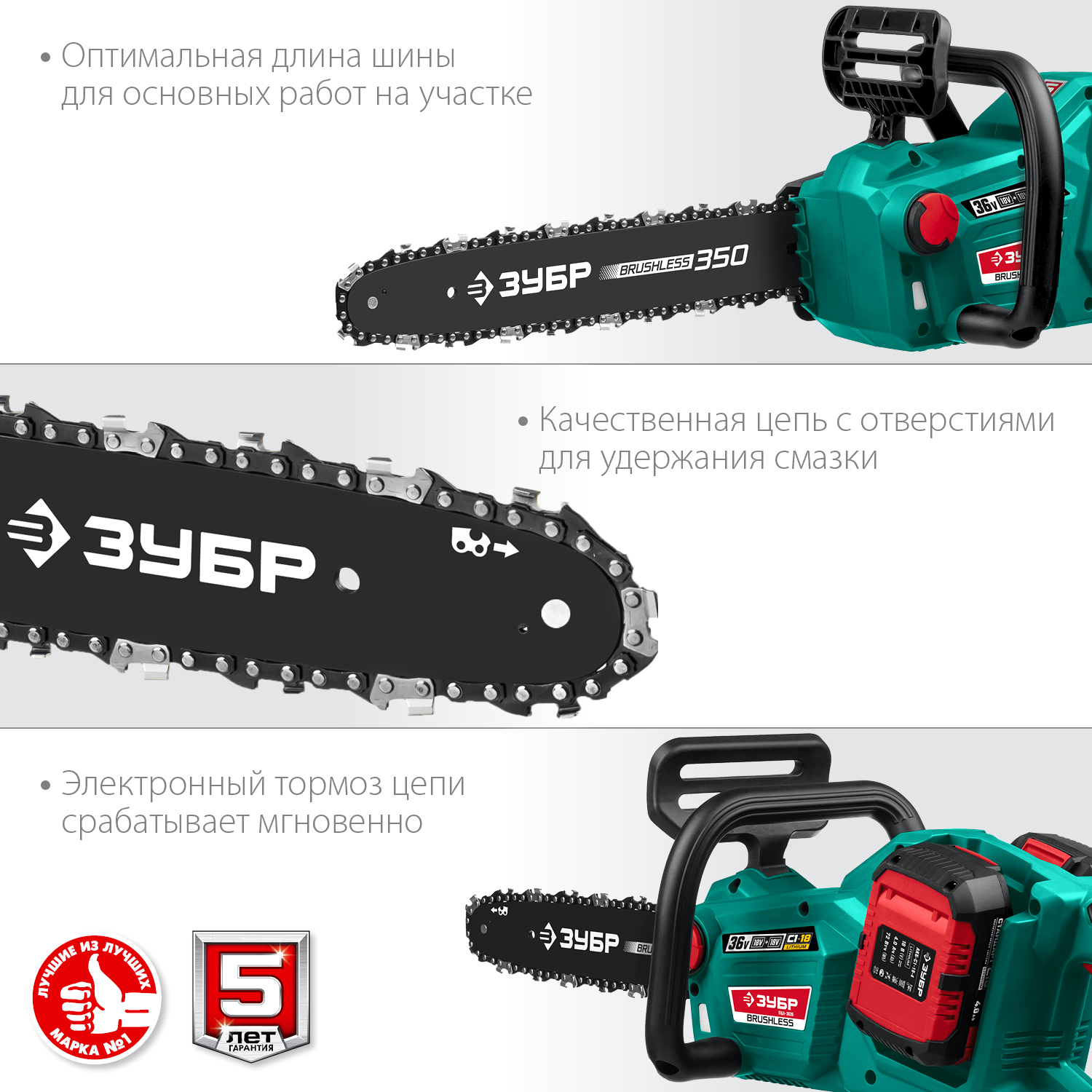 - Мощный двигатель напряжением 36 В ускоряет процесс пиления, а шина длиной 350 мм позволяет справляться с большинством веток