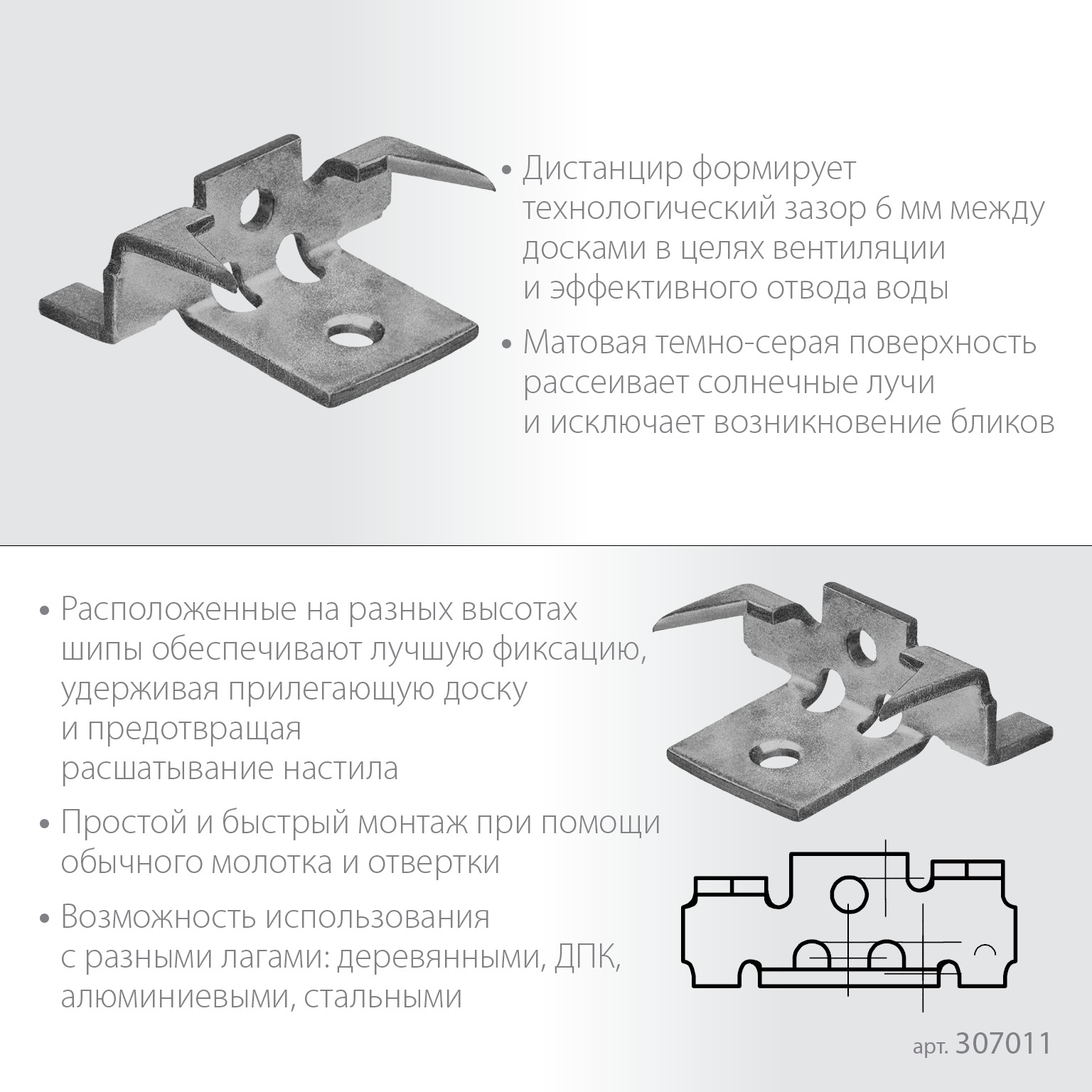 - Основание крепежа обеспечивает дополнительную вентиляцию между лагой и доской
