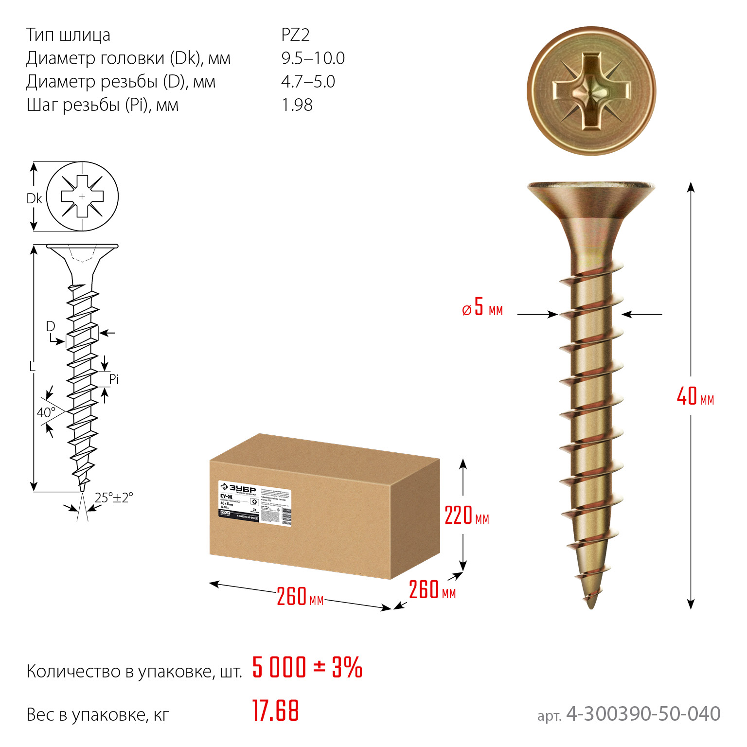 ЗУБР СУ-Ж 40 x 5.0 мм, желтый цинк, Универсальный саморез, 17.68 кг (4-300390-50-040)
