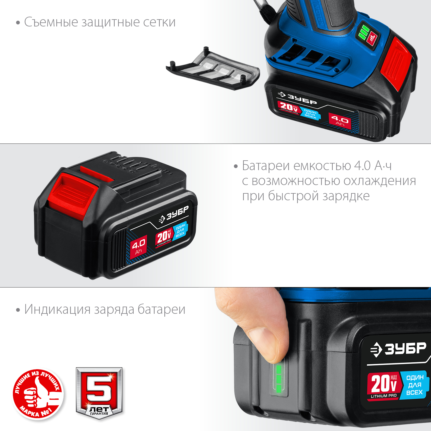 - отсутствие потери мощности в процессе работы - Две батареи емкостью 4 Ач емкости в комплекте для безостановочной работы