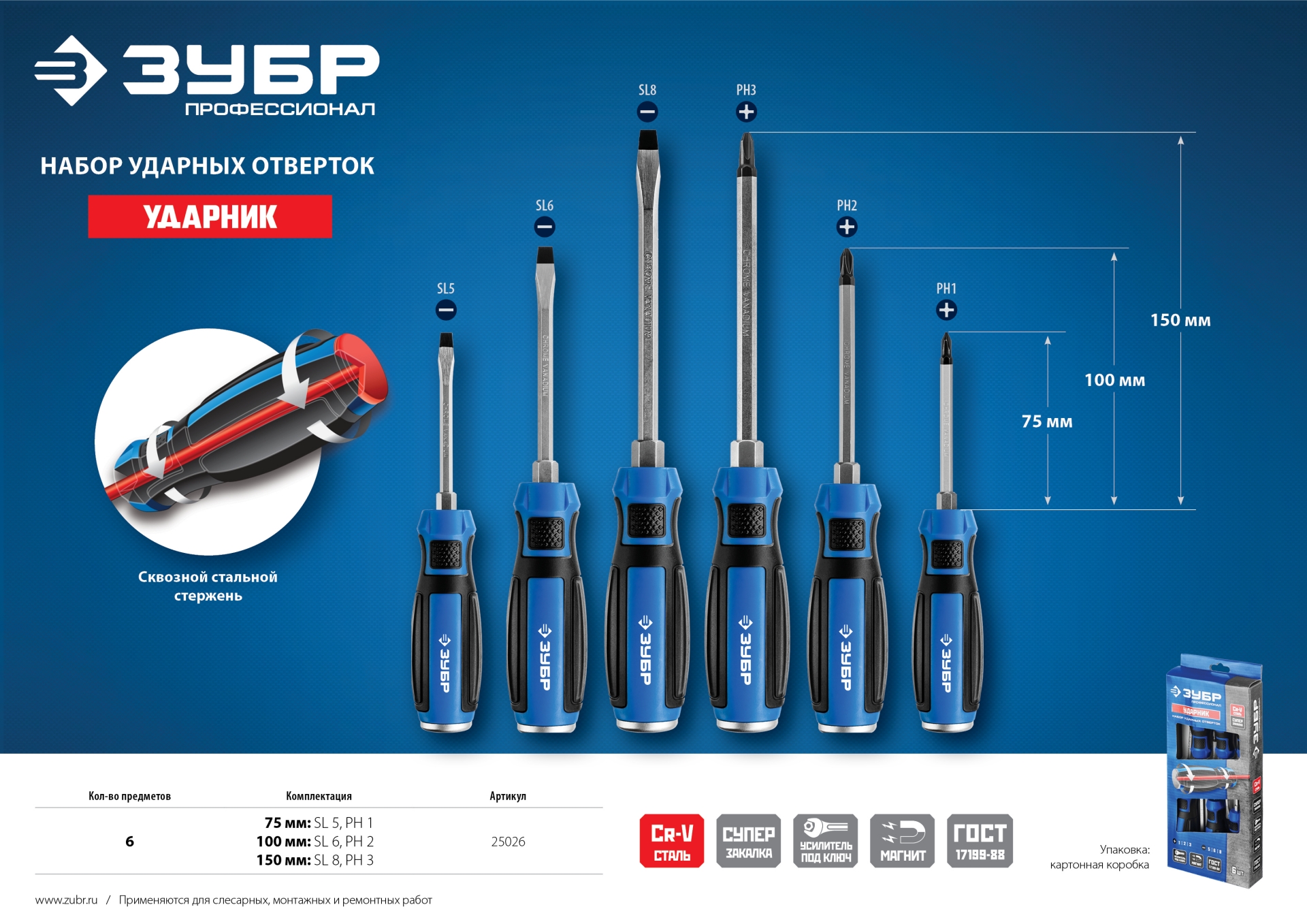 - Сквозной стержень и стальной затыльник позволяют применять ударные нагрузки.