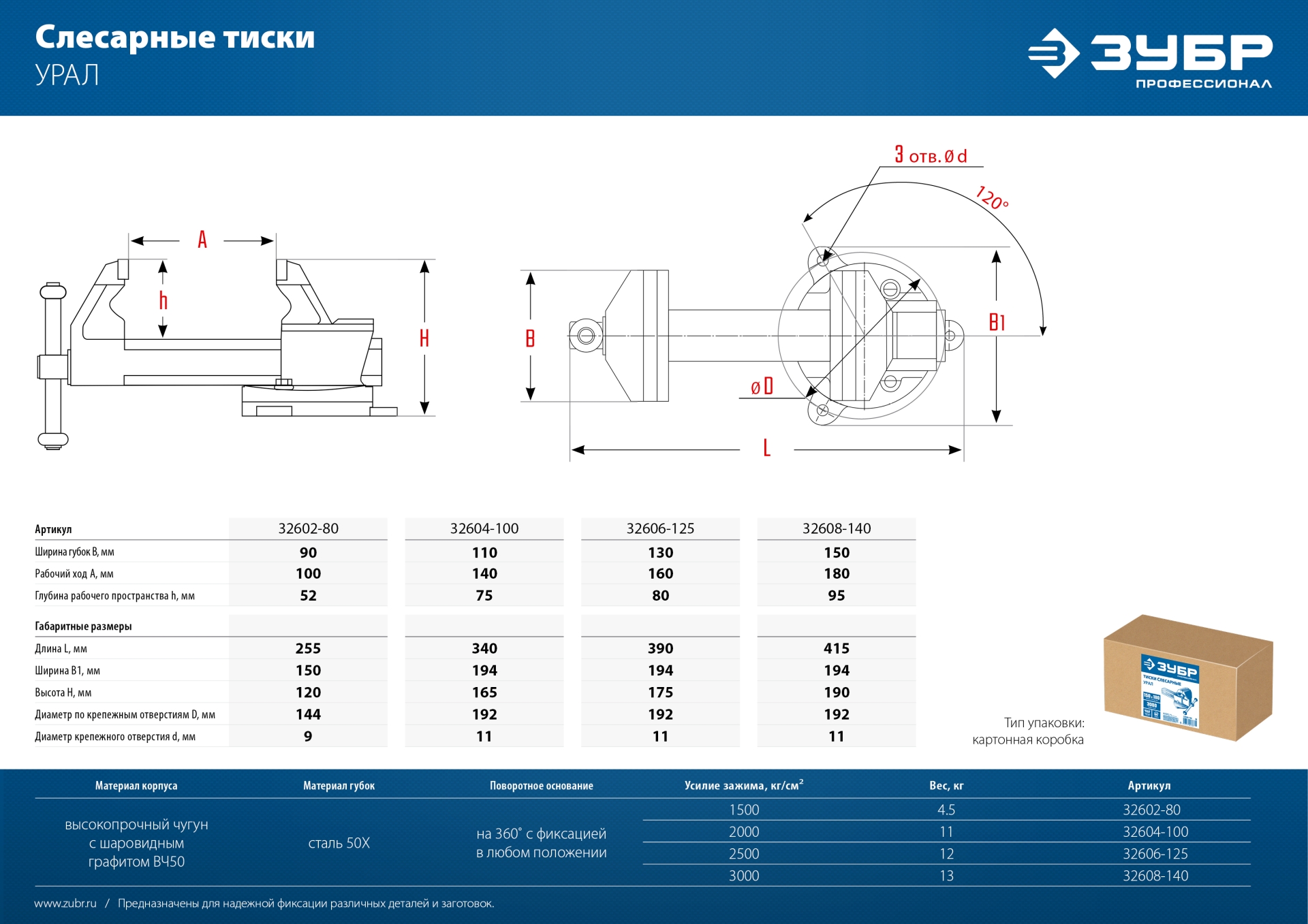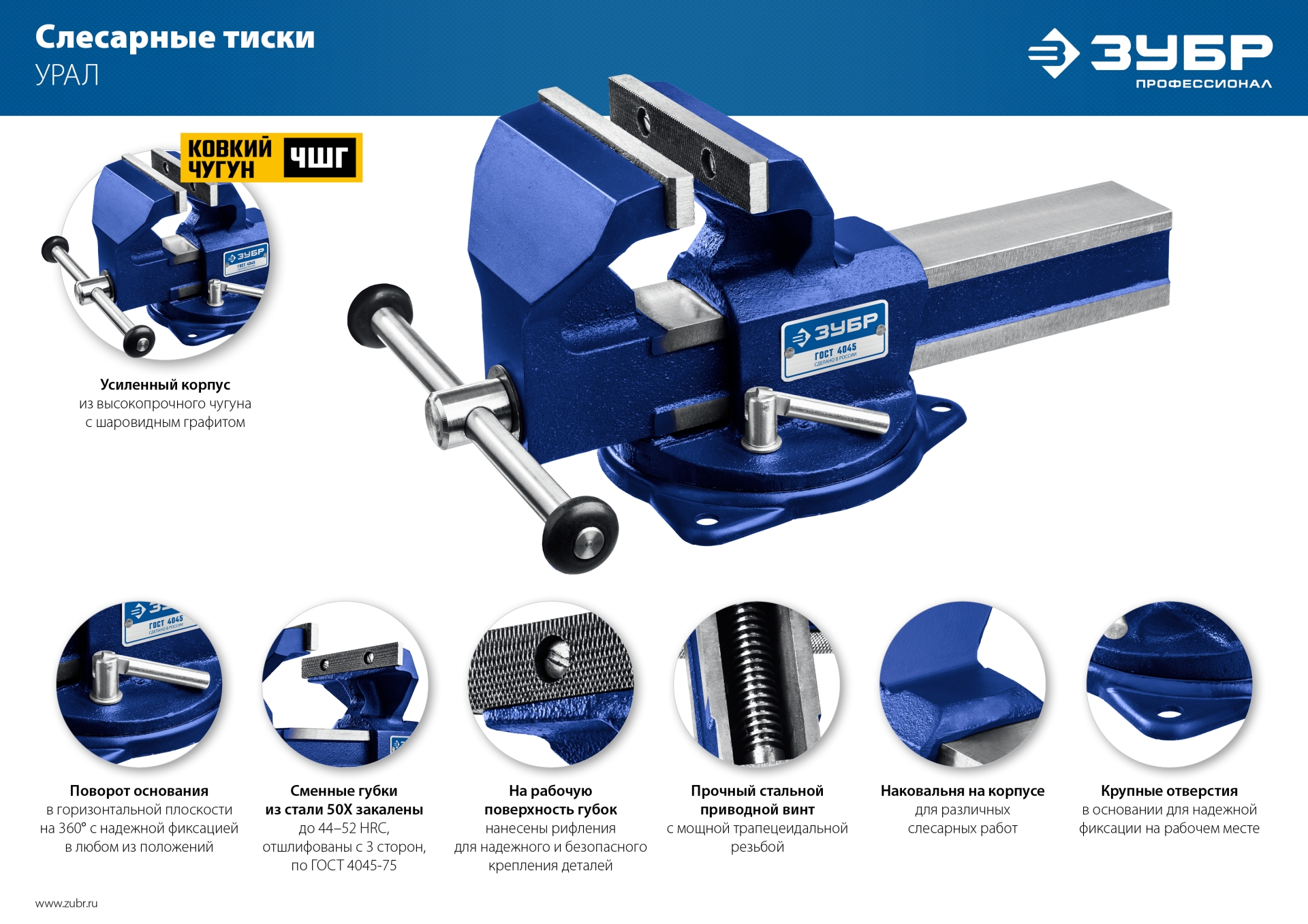 Тиски слесарные ЗУБР изготовлены из высокопрочного чугуна с шаровидным графитом, соответствуют самым высоким техническим требованиям. Поворотное основание на 360˚. Обеспечивают длительную и качественную работу.
