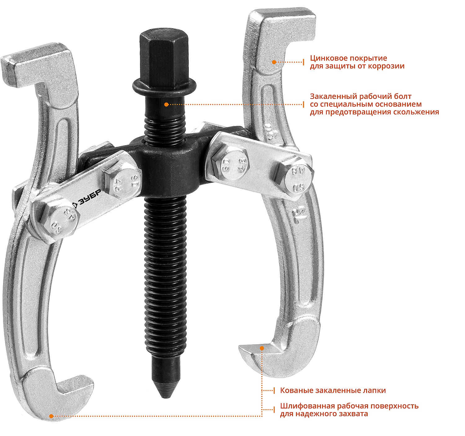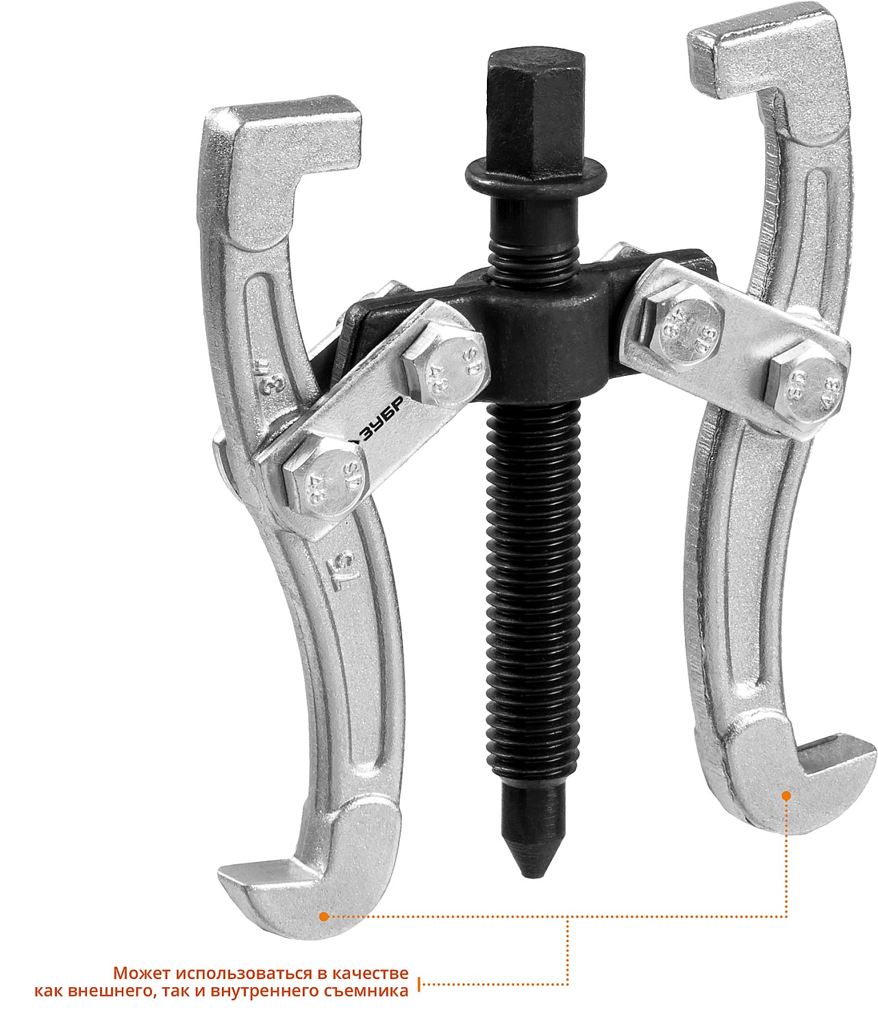 Захваты съемника выкованы из качественной инструментальной стали, что обеспечивает долгий срок службы при работе с высокими нагрузками. Позволяет работать с широким рядом узлов