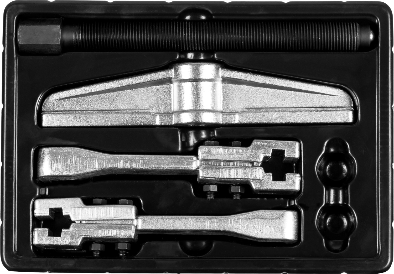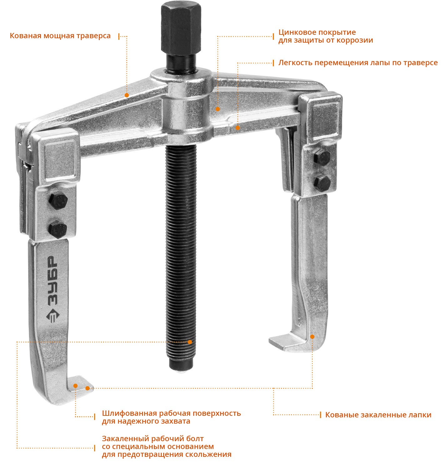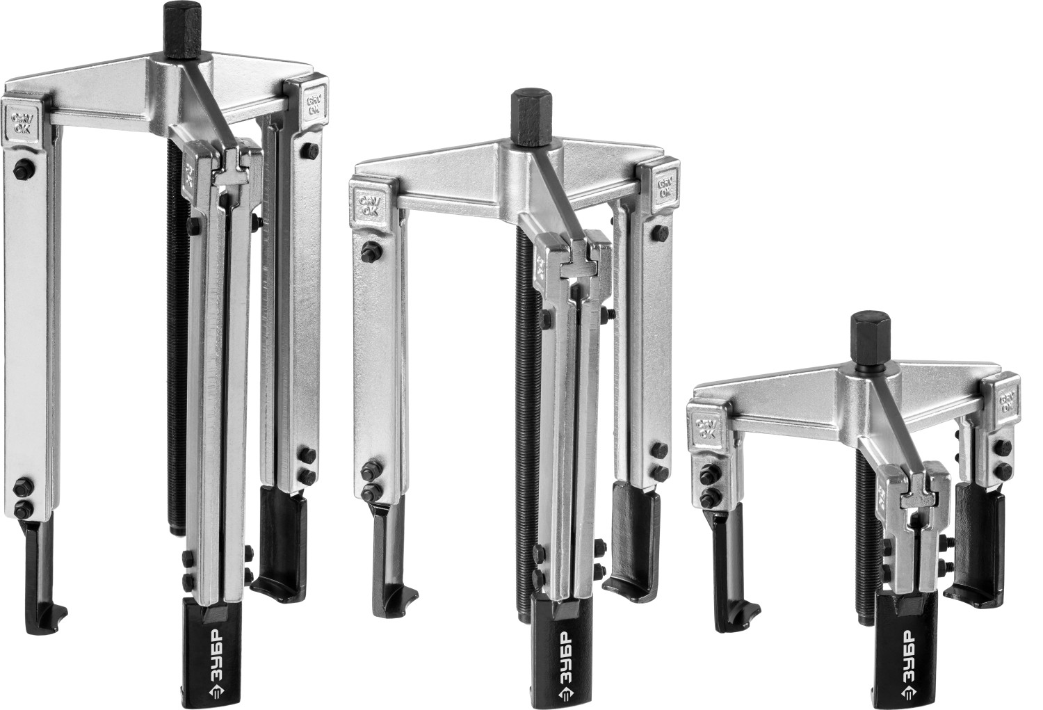 Захваты съемника выкованы из качественной инструментальной стали, что обеспечивает долгий срок службы при работе с высокими нагрузками. Позволяет работать с широким рядом узлов