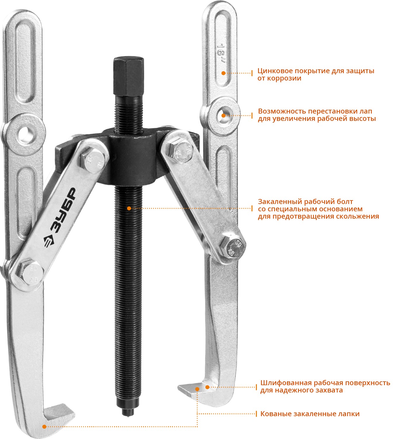Захваты съемника выкованы из качественной инструментальной стали, что обеспечивает долгий срок службы при работе с высокими нагрузками. Позволяет работать с широким рядом узлов