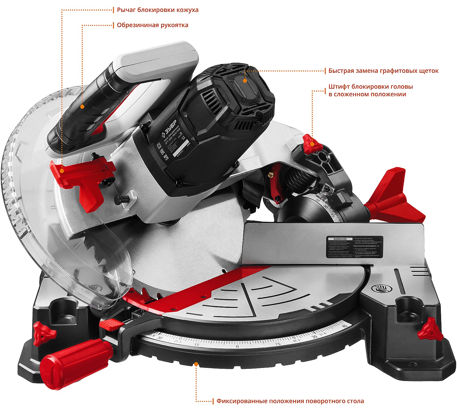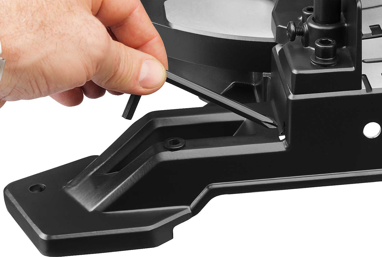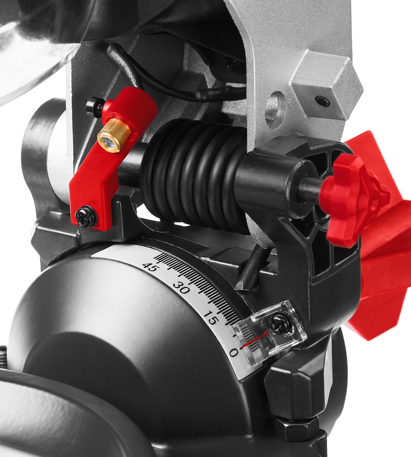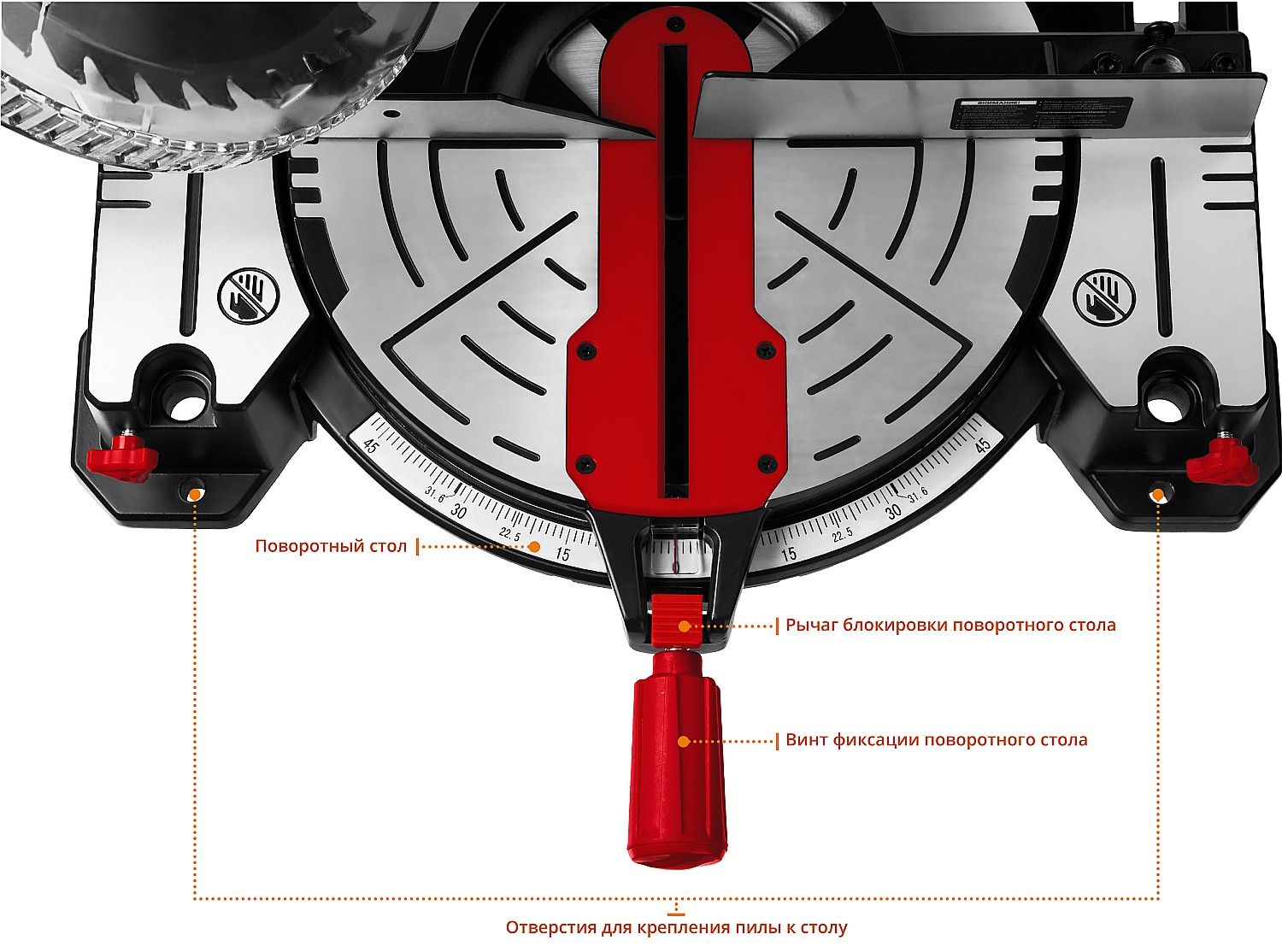 - Фиксирующийся в любом положении поворотный стол и удобная регулировка наклона облегчают установку угла пиления
