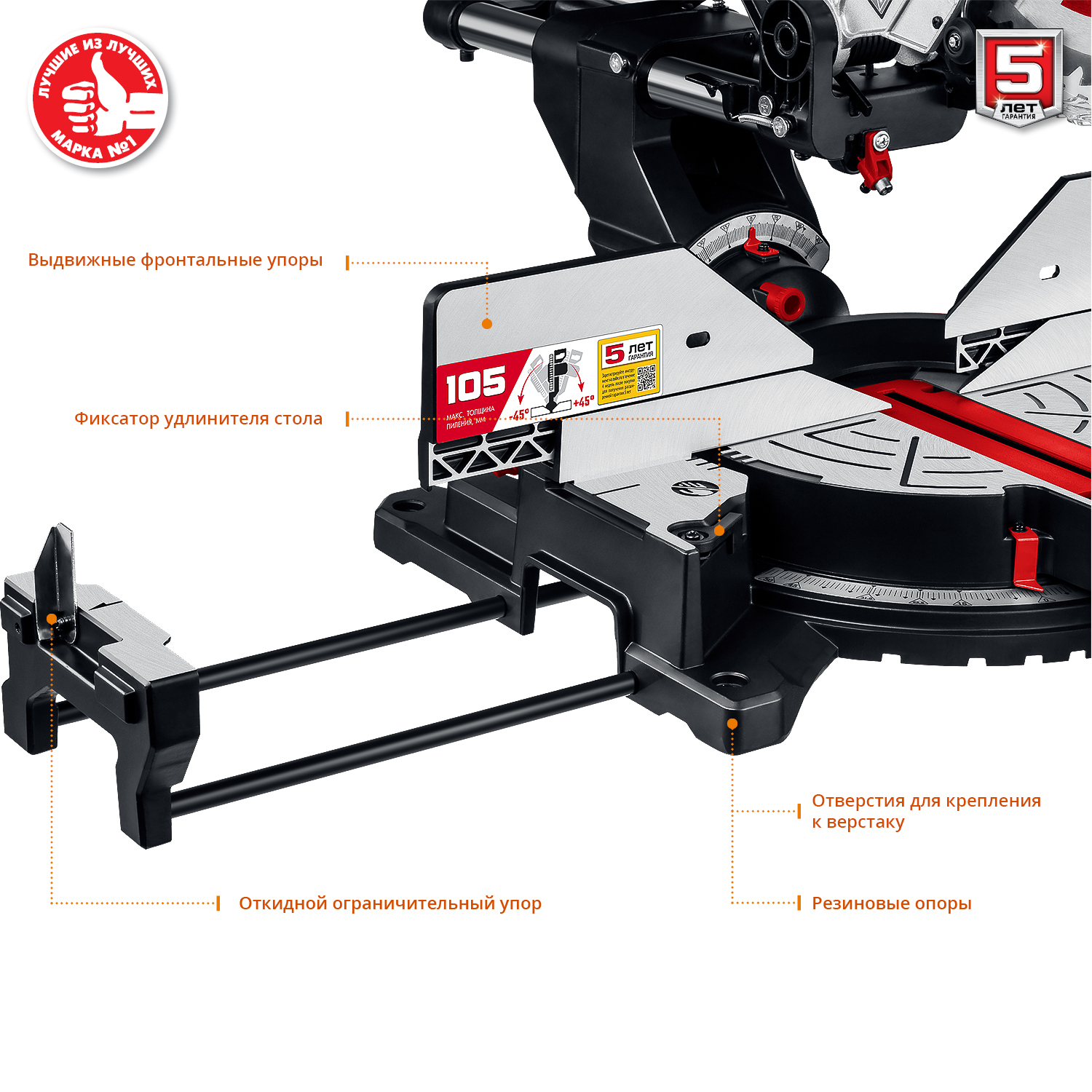 - Удлинительные опоры стола предотвращают опрокидывание отпиленной заготовки, что повышает безопасность