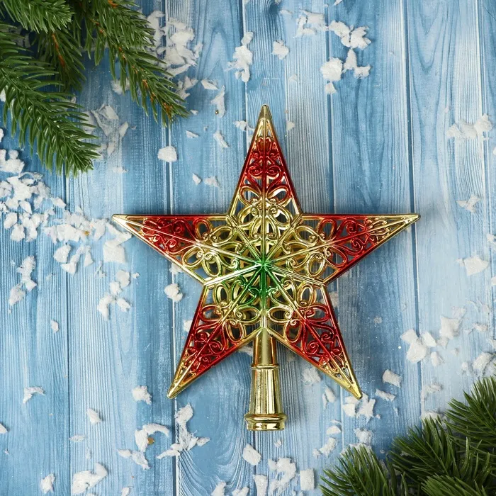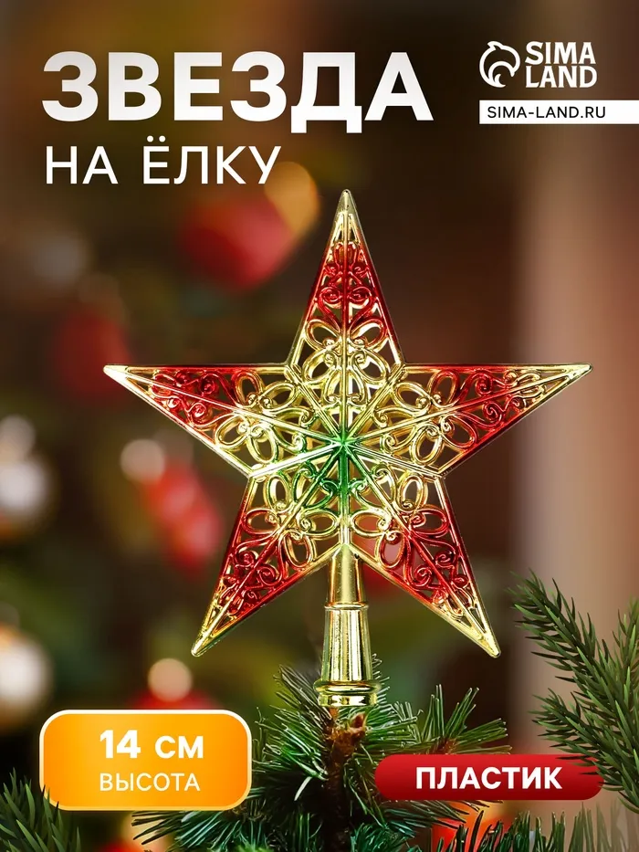 Добавьте праздничному дереву изысканности с новогодним наконечником «Барочная звезда» — компактным украшением с резным узором. Мерцающий золотисто-красный дизайн и размер 12×14 см делают его ярким акцентом на ёлке без излишней пышности. Изделие выполнено из прочного пластика — лёгкого, безопасного и долговечного.